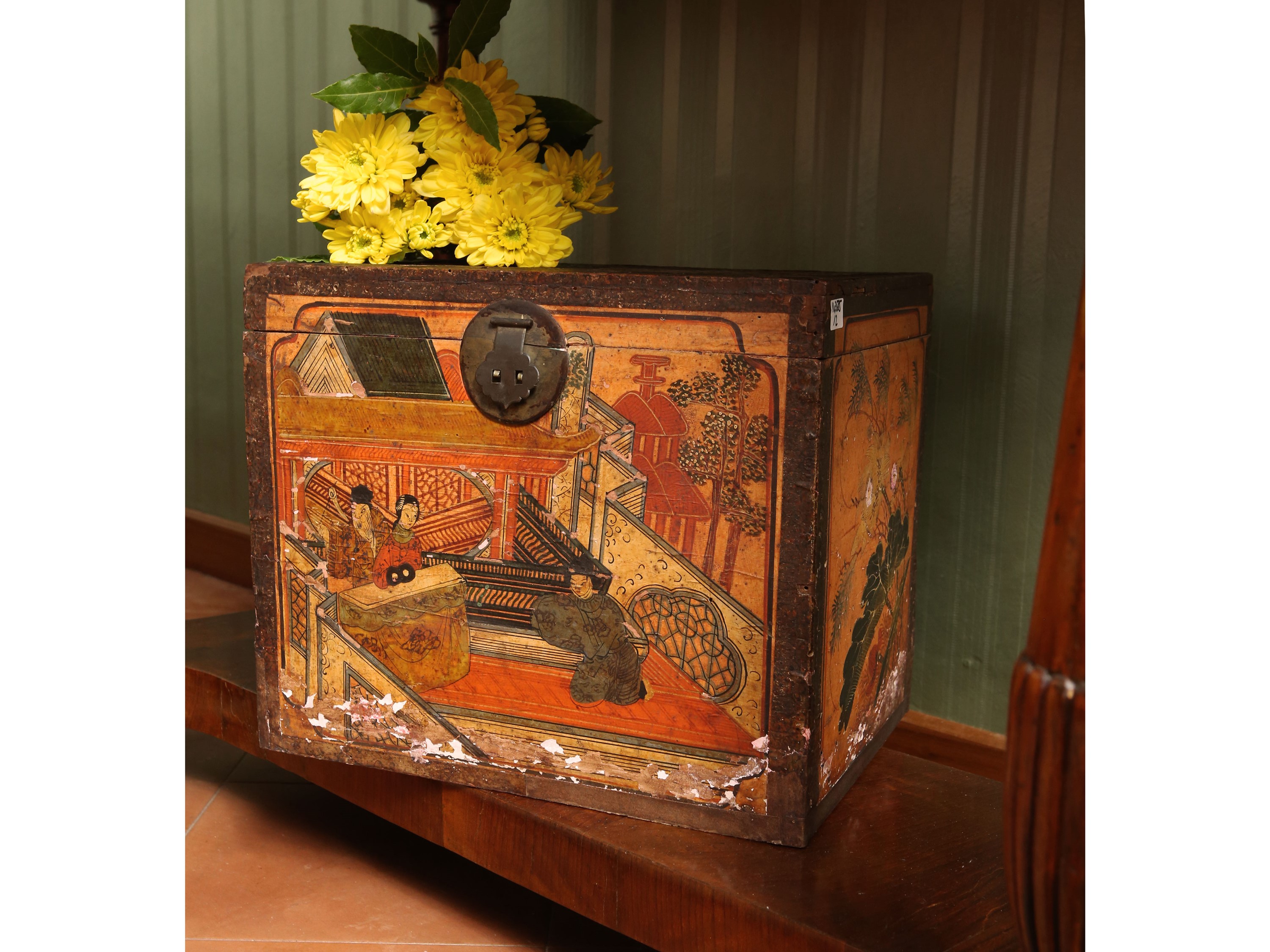 Cina, inizio del XX secolo uno scrigno decorato a chinoiserie con scene di corte ed un disegno a china e acquerello su carta applicato a tavoletta raffigurante una scena di duello, difetti