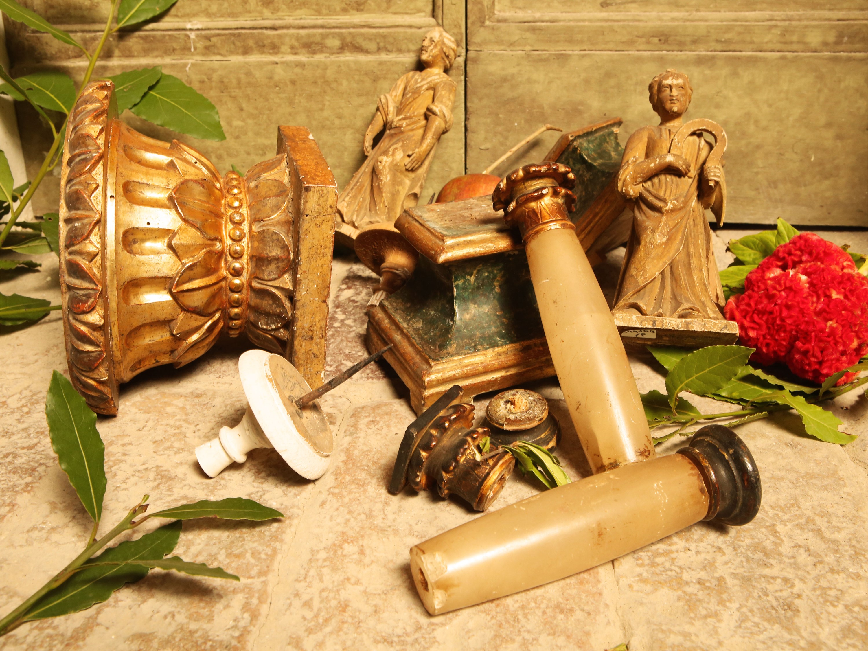 XVIII secolo composto da coppia di torcere con steli in alabastro da assemblare, coppia di piccole sculture lignee raffiguranti santi ed una base a coppa, alcuni difetti