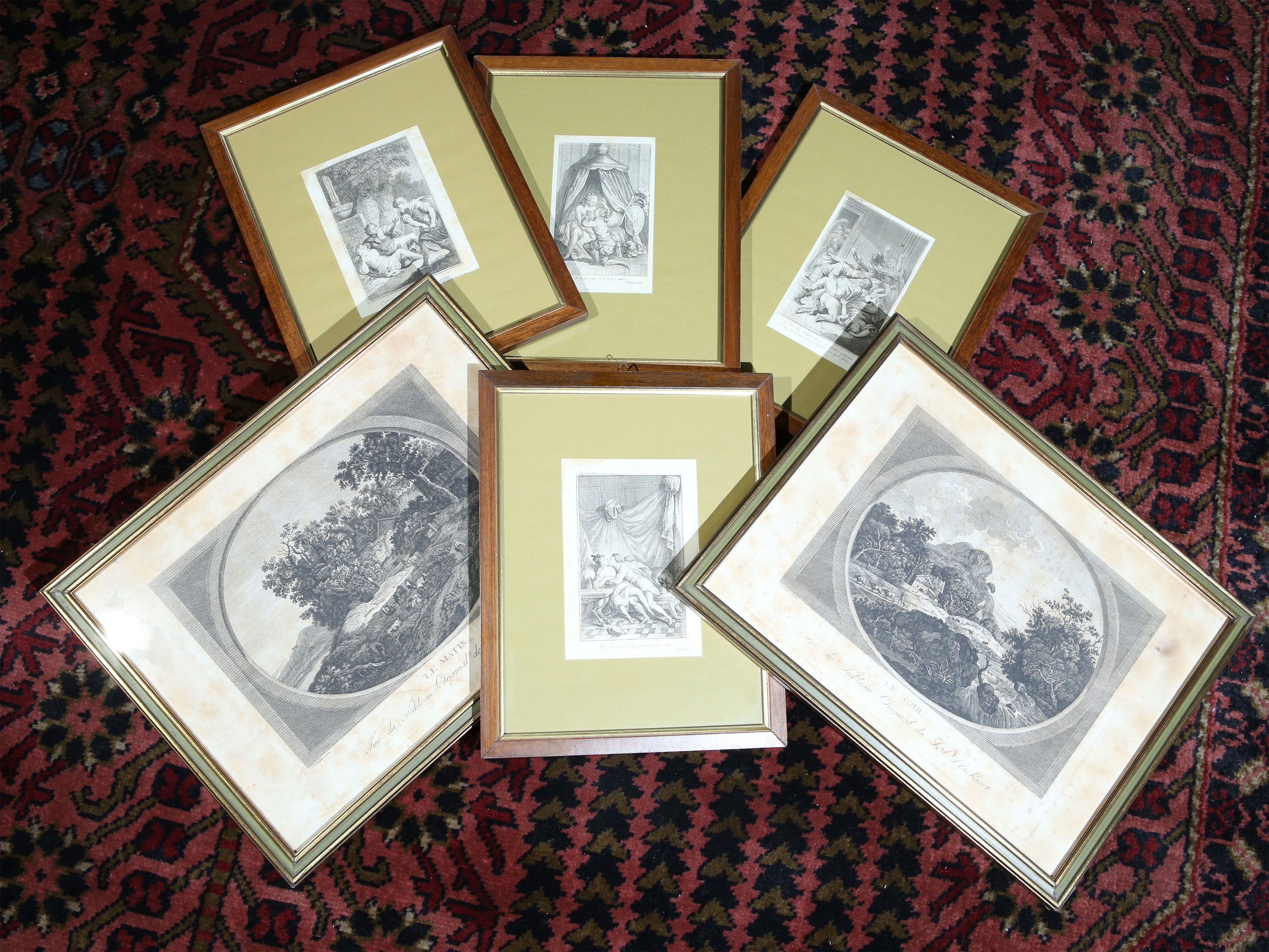 XVIII/XIX secolo due incisioni raffiguranti La Mattina e La Sera dai dipinti di Jakob Philipp Hackert e una serie di quattro incisioni riproducenti scene erotiche, in cornice, alcuni difetti