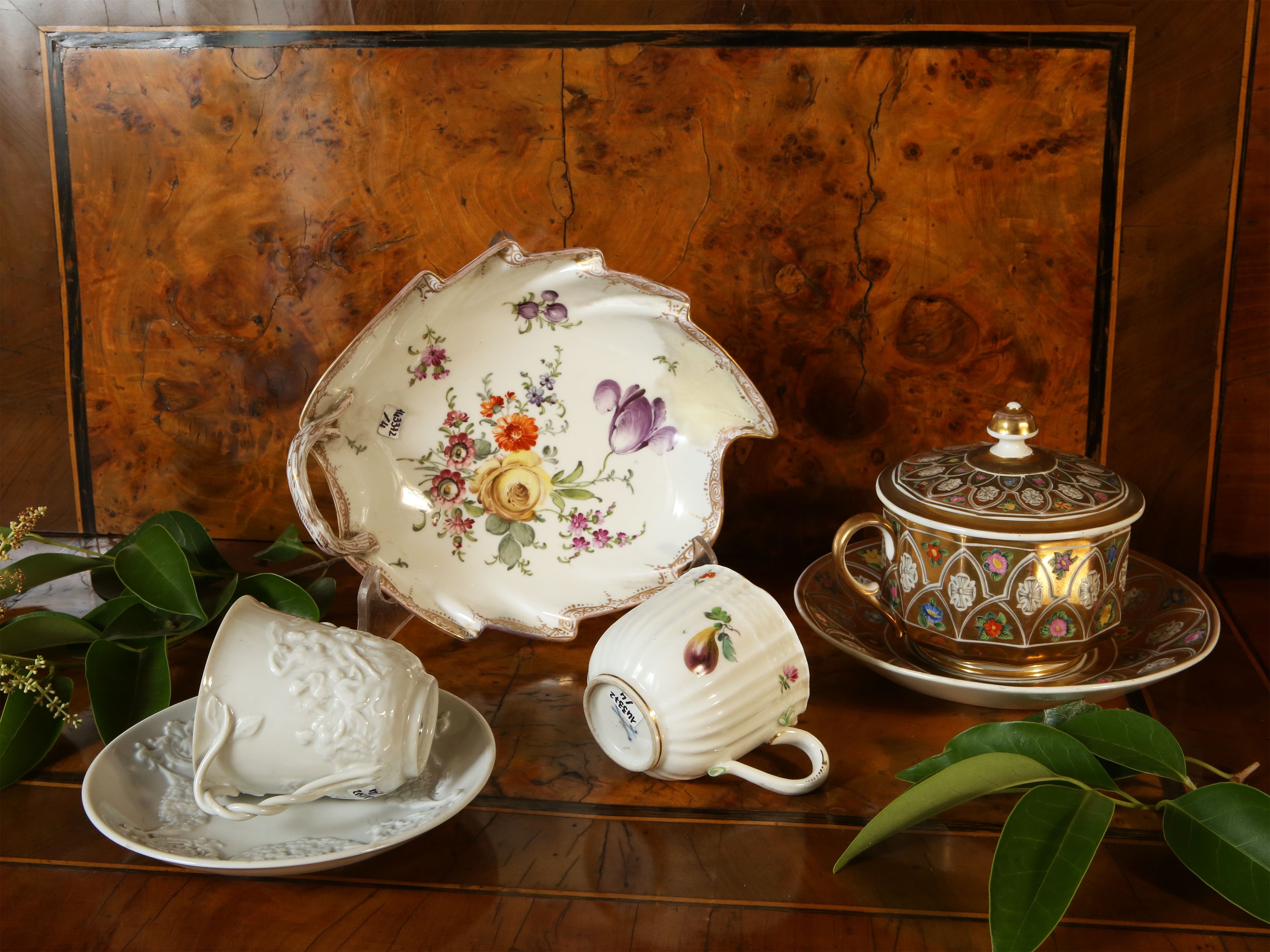 XIX secolo composto da una tazzina istoriata di Capodimonte con il suo piattino, un vassoietto a foglia dipinto con fiori policromi, Dresda, una tazza da puerpera KPM, dipinta con fiori su fondi dorato, completa ed una tazzina di Meissen, alcuni difetti (4)