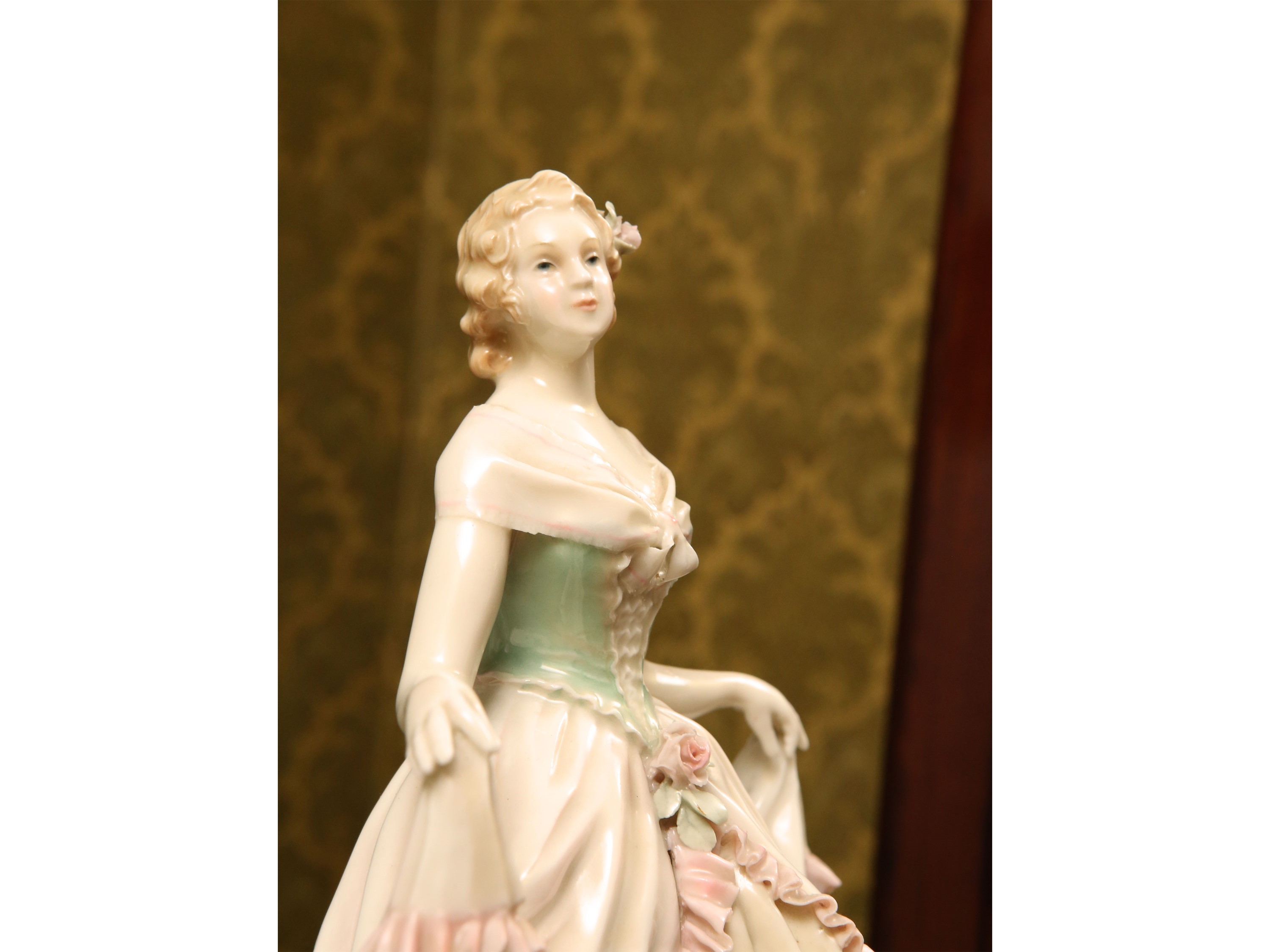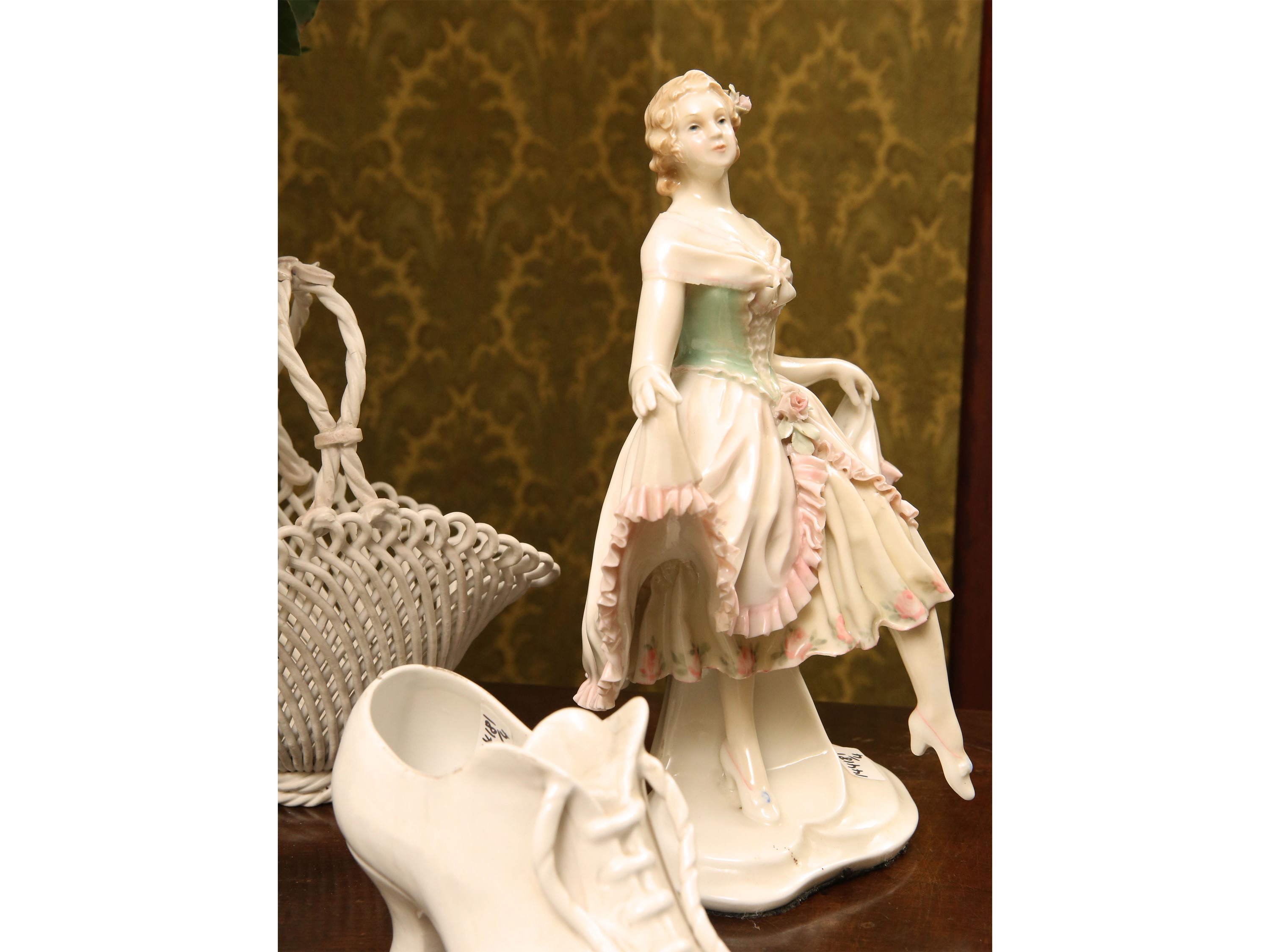 inizio del XX secolo composto da una dama ed una scarpetta in porcellana, un cestino in biscuit ed una foglia in terraglia, lievi difetti