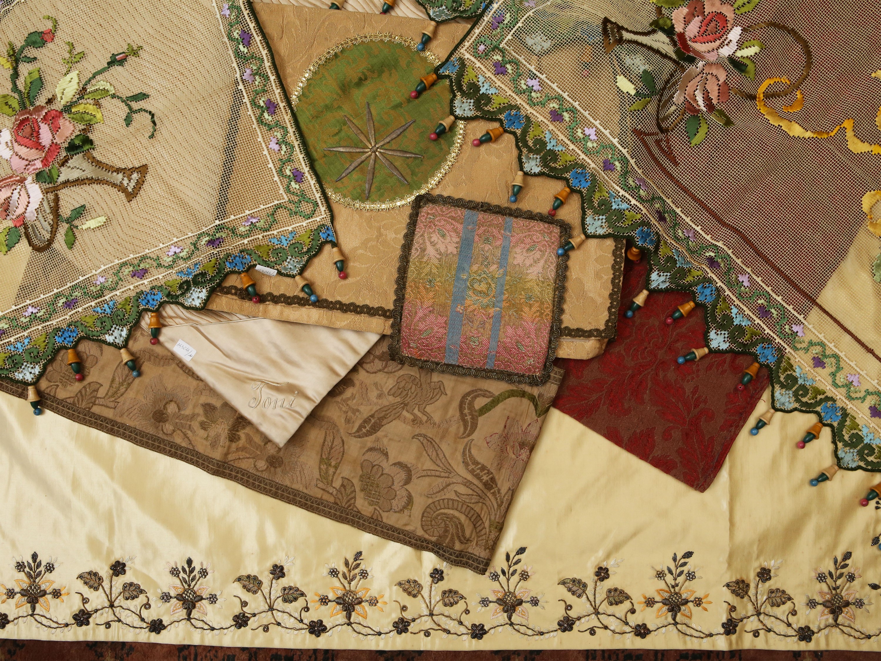 XIX/XX secolo di varie tipologie, tra cui una tovaglietta da altare in seta ricamata con motivi floreali in fili d'argento ed un set a punto stuoia