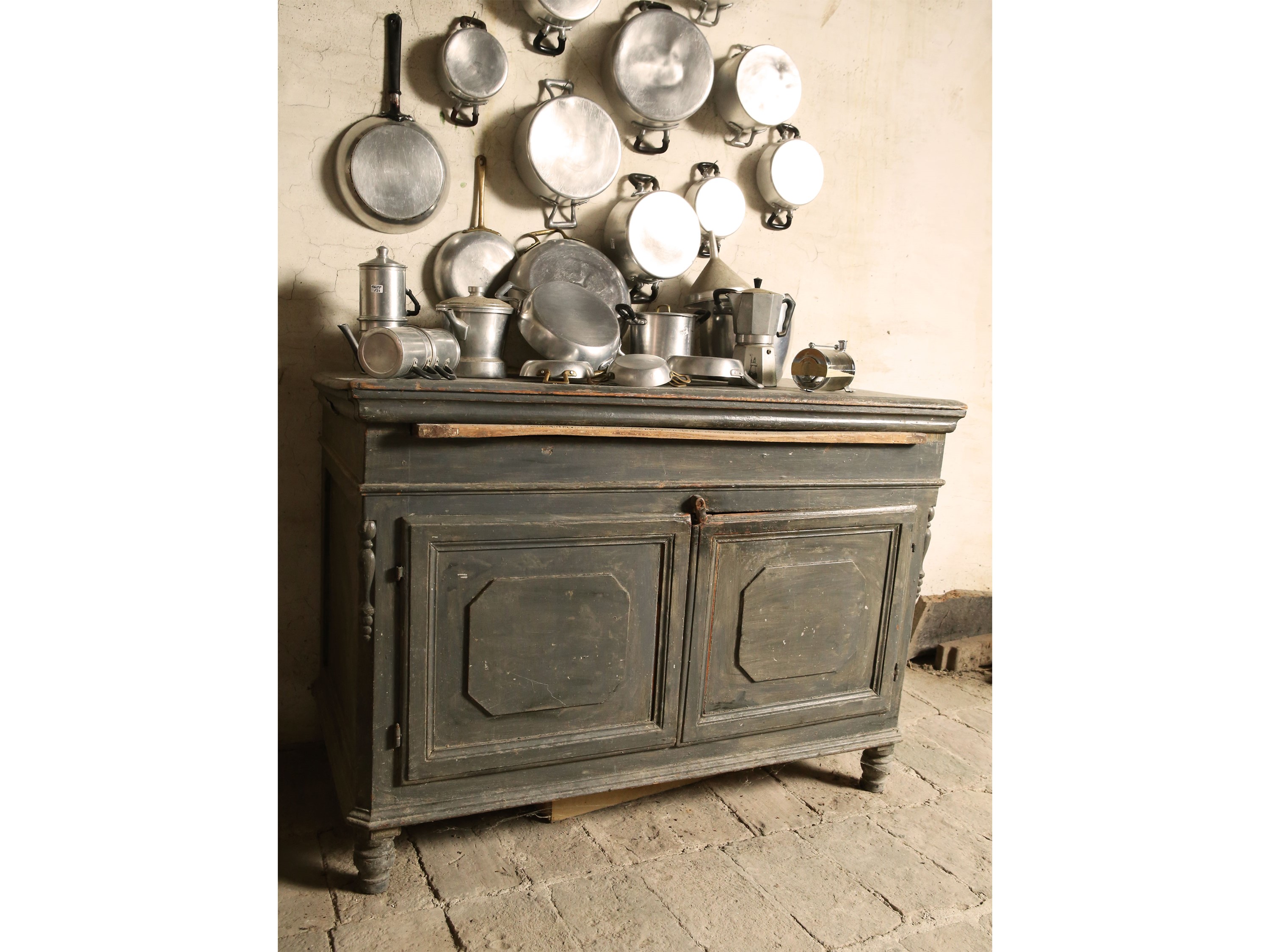 seconda metà del XIX secolo piano da alzarsi a celare vano per la farina, un tiretto sottostante per stendere la sfoglia, due sportelli sul fronte con cornici in rilievo, piedi a cipolla, difetti