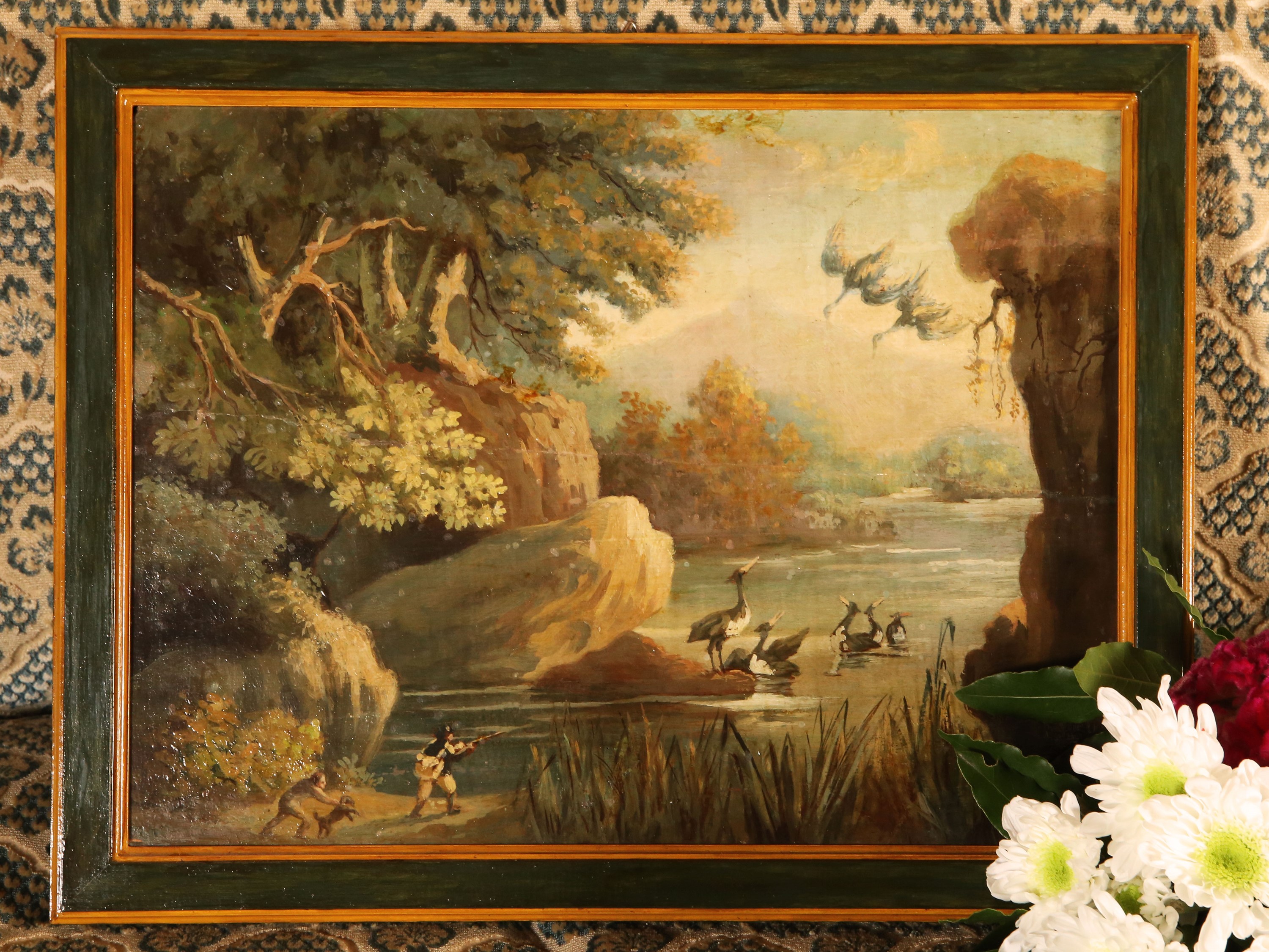 Paesaggio lacustre con cacciatore e volatili