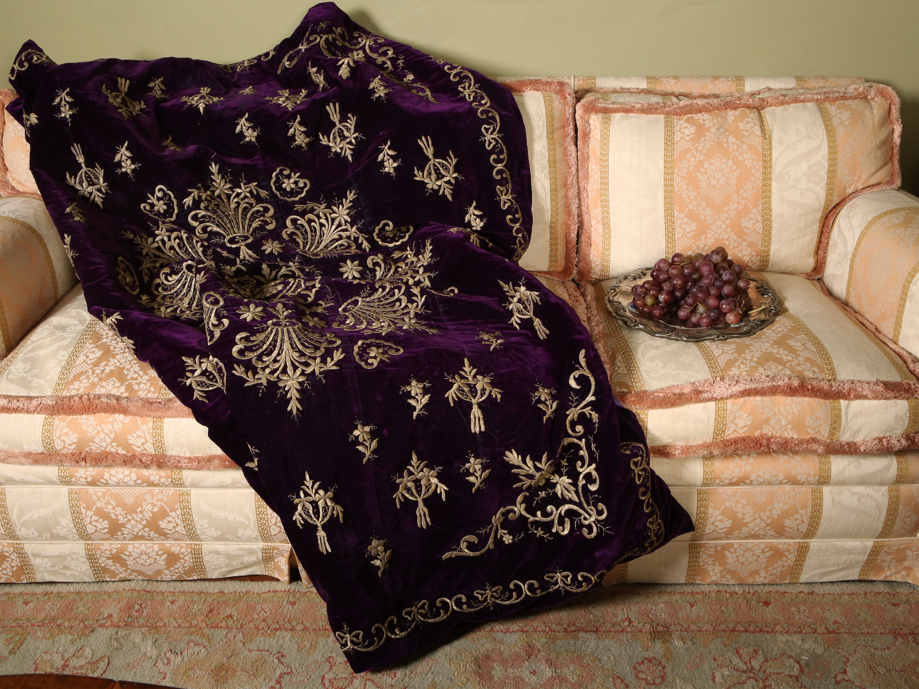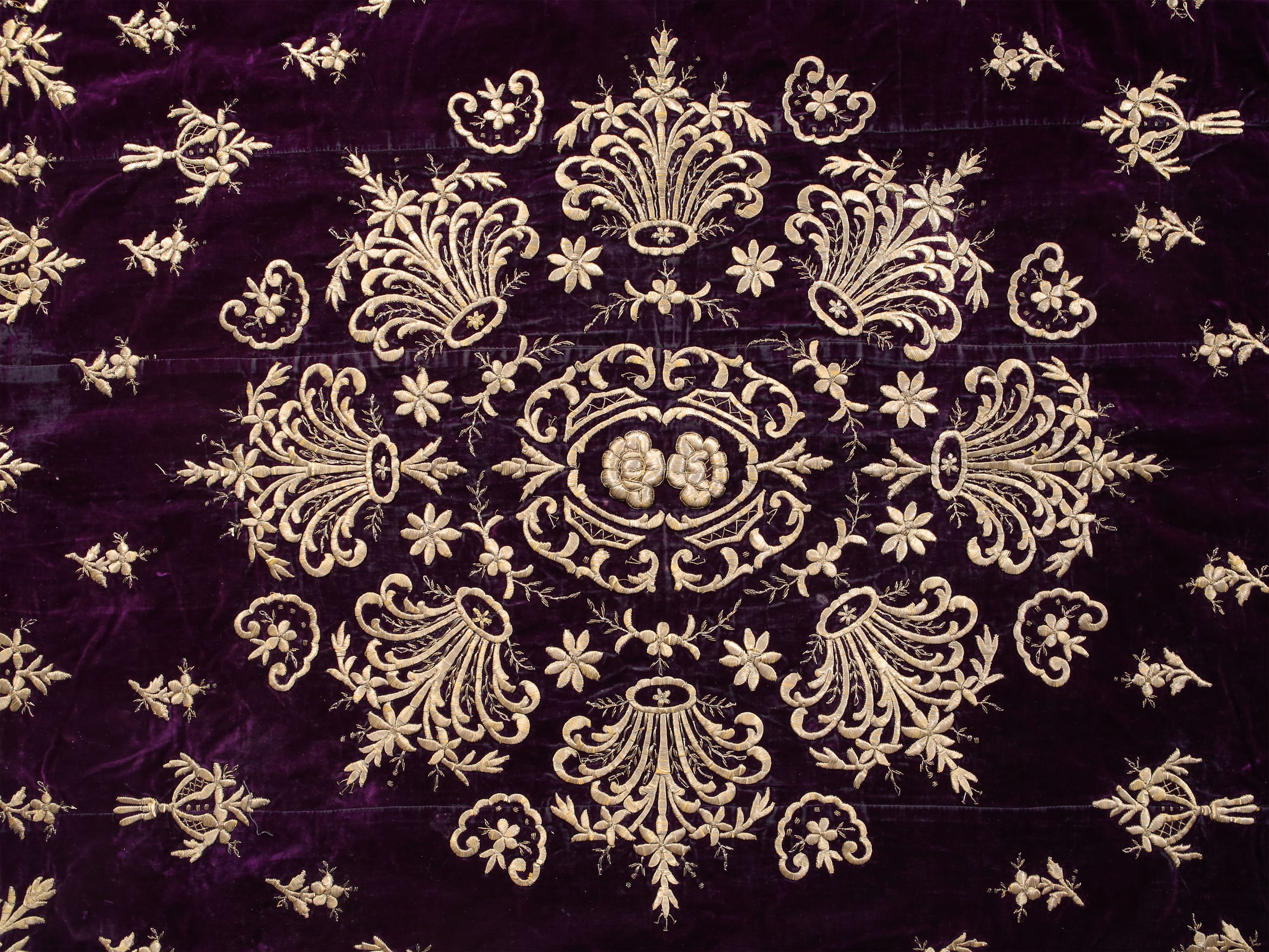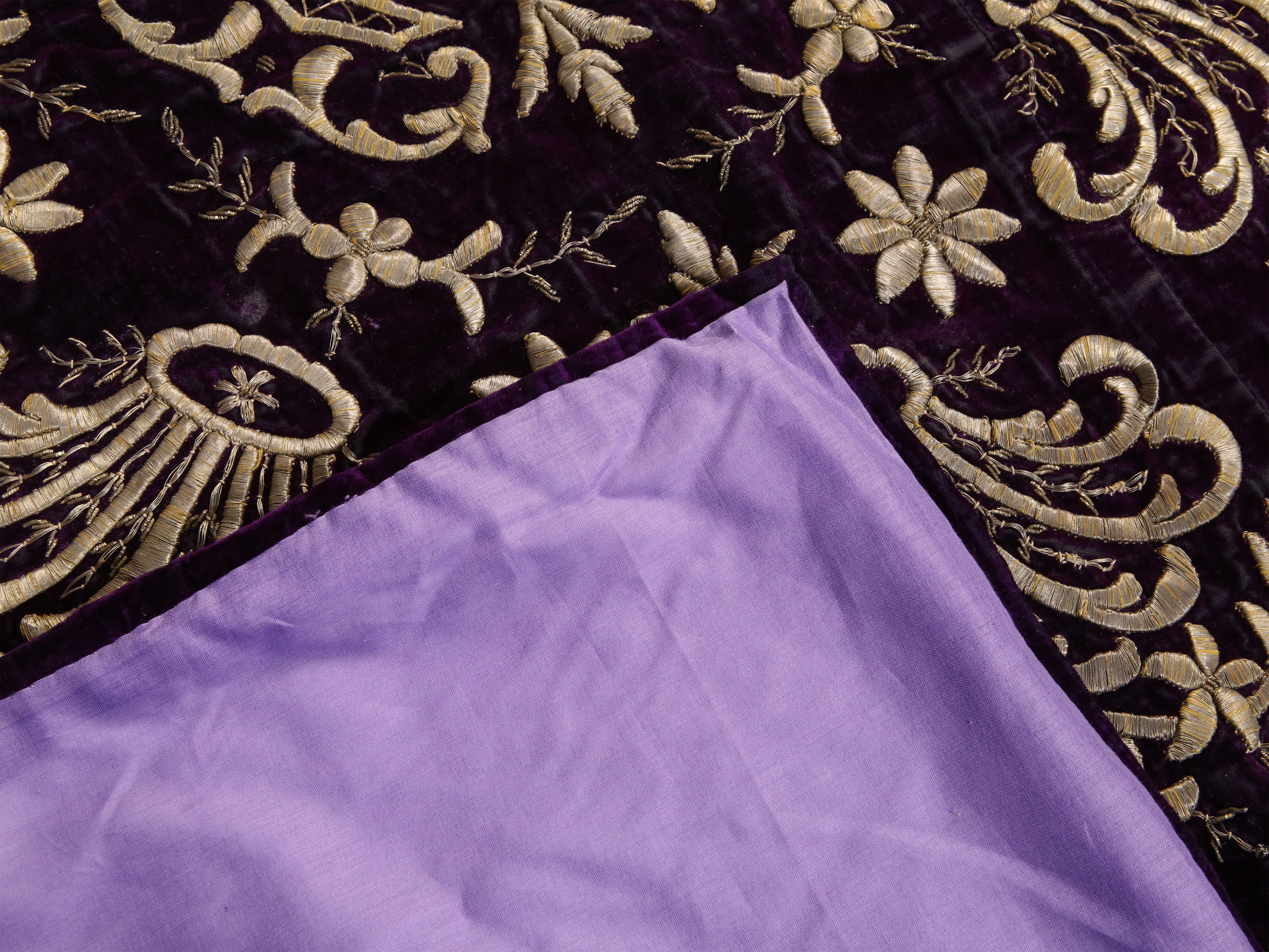 XIX secolo finemente ricamato in fili metallici dorati con motivo di corone e fiori, fodera in cotone lilla di epoca posteriore