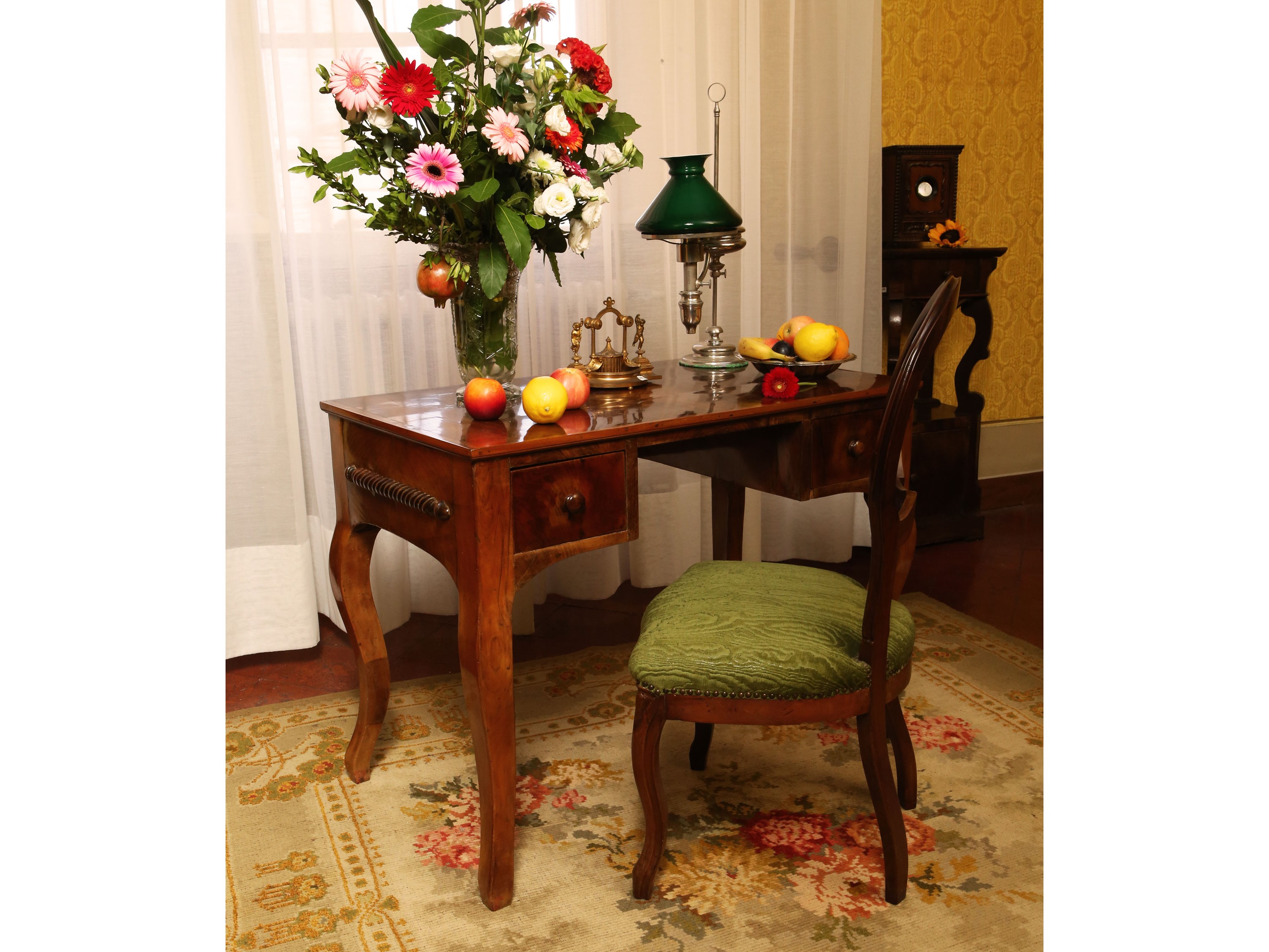 scrivania h cm 73x96x53 (2) Italia centrale, seconda metà del XIX secolo due mezzi cassetti laterali, gambe mosse, abbinata a sedia in noce, schienale arrotondato, sedile imbottito e rivestito in velluto moiré verde