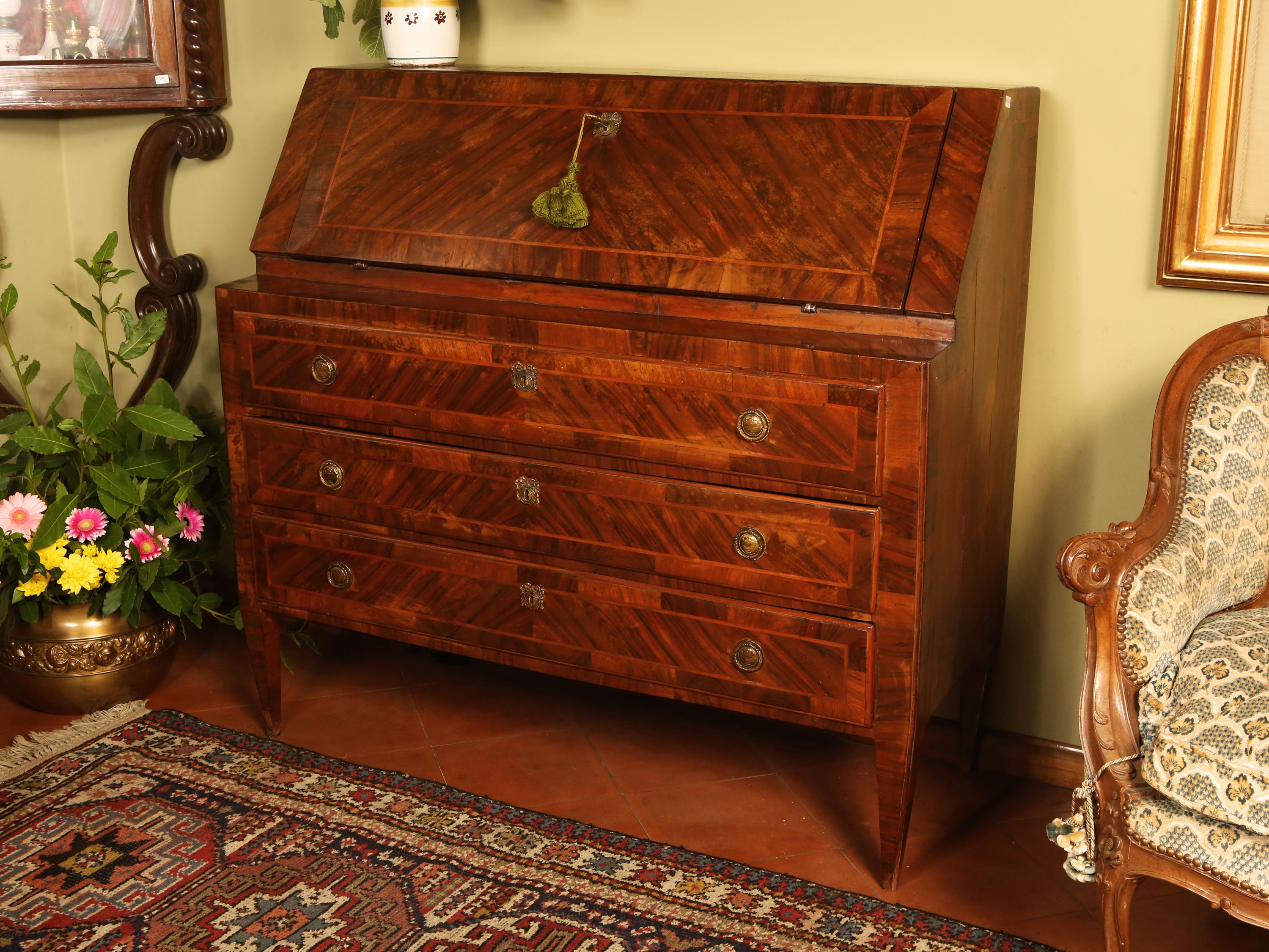 h cm 105x112x44 fine del XVIII secolo intarsiato con filettature in legni di frutto, piano a calatoio a celare scarabattolo, tre cassetti sul fronte dritto, piedi a faretra, alcuni difetti