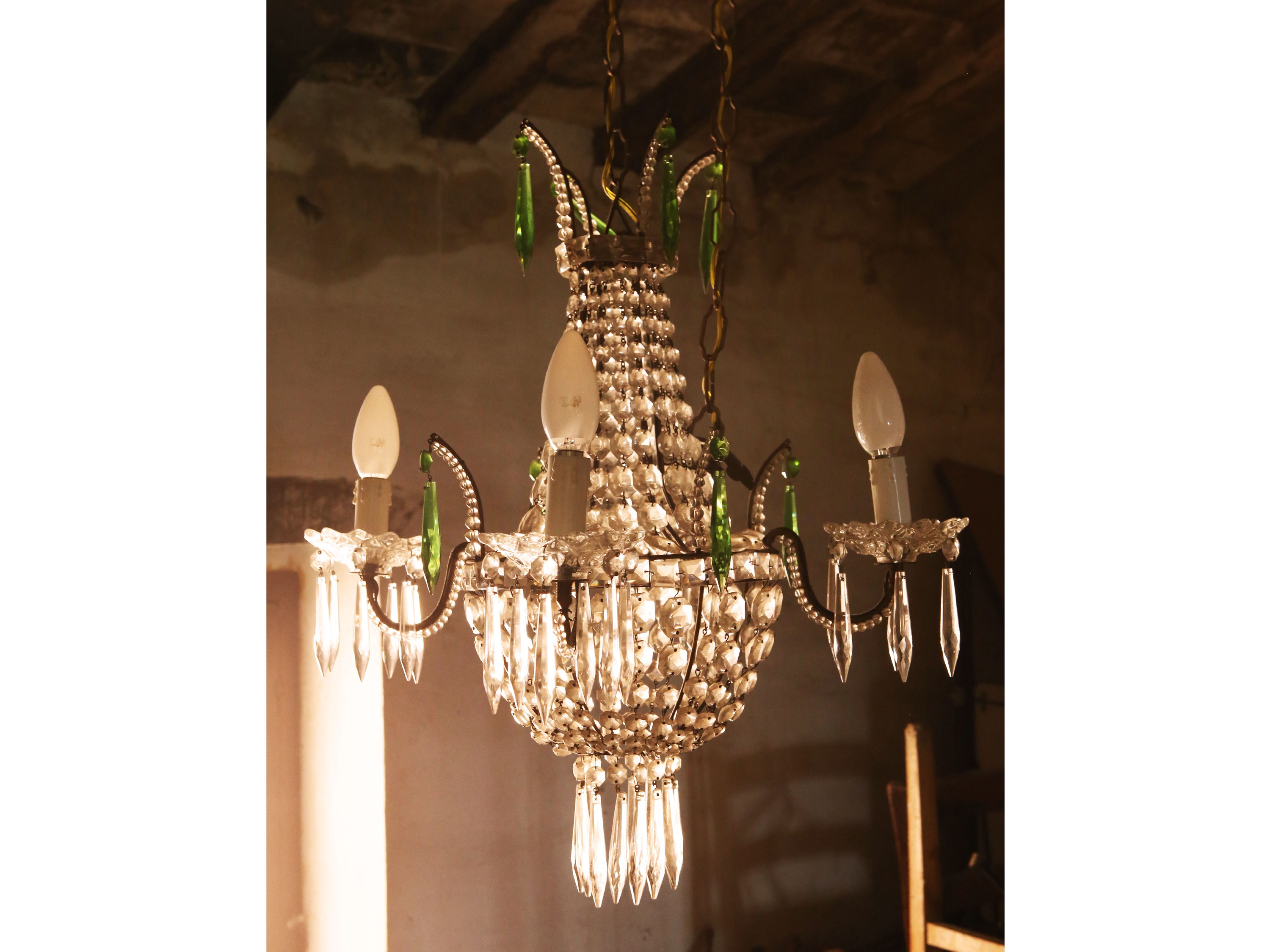 inizio del XX secolo quattro bracci portacandele, catene di perle di vetro e pendenti verdi, possibili lievi difetti