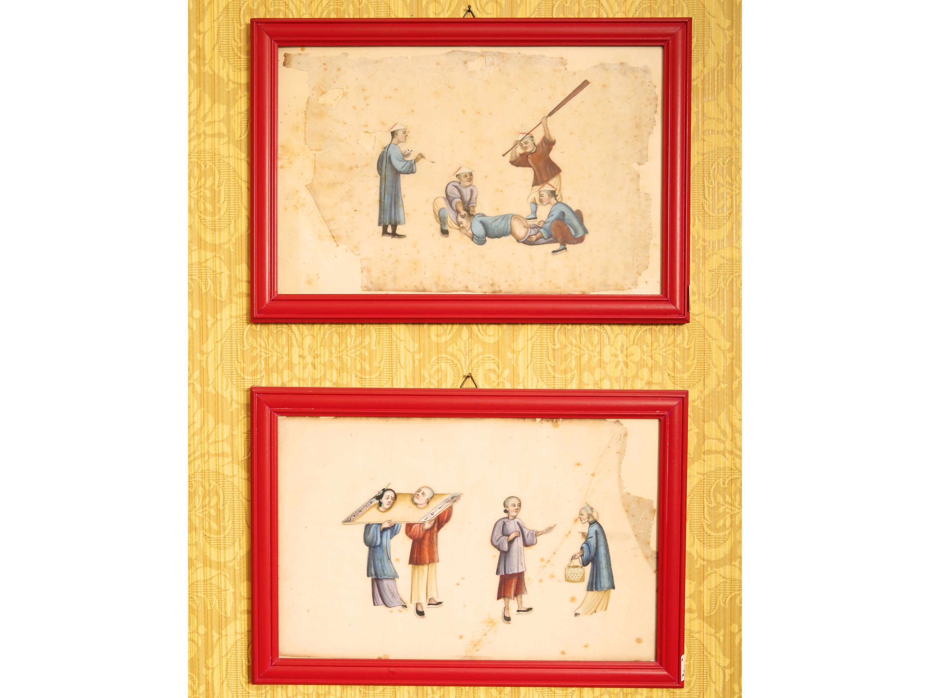 Cina, fine del XIX secolo due dipinti a tempera su seta, difetti, in cornice