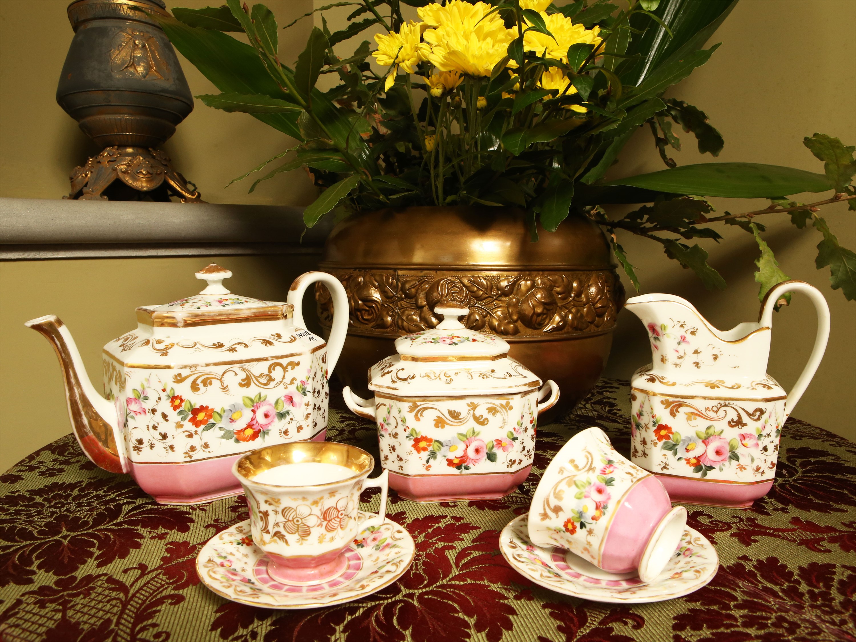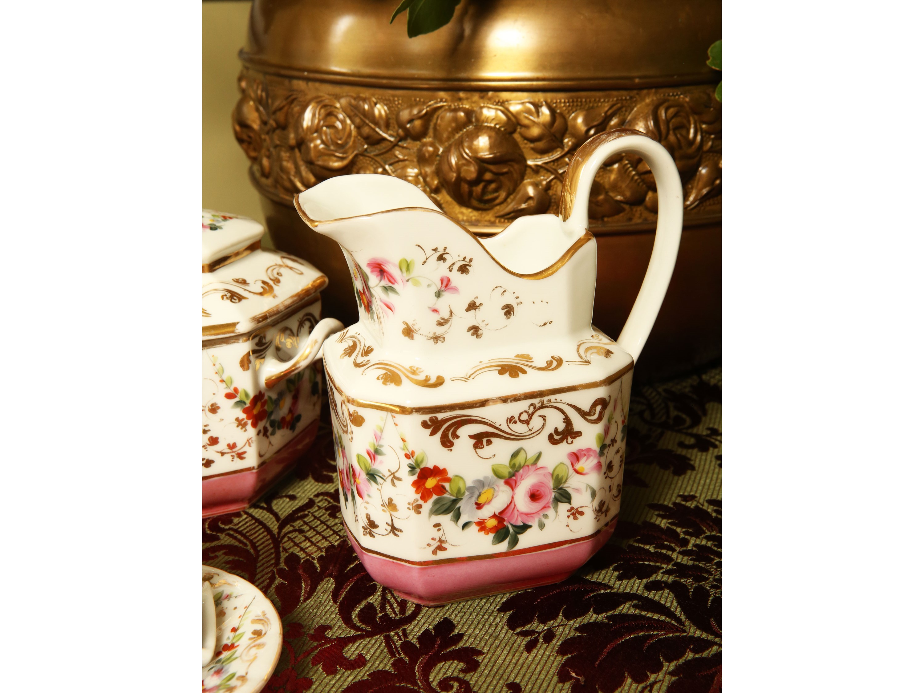 Francia, metà del XIX secolo dipinto con fiori multicolori, bordi rosa e lumeggiature dorate, composto da caffettiera, lattiera, zuccheriera e serie di 12 tazzine con piattino