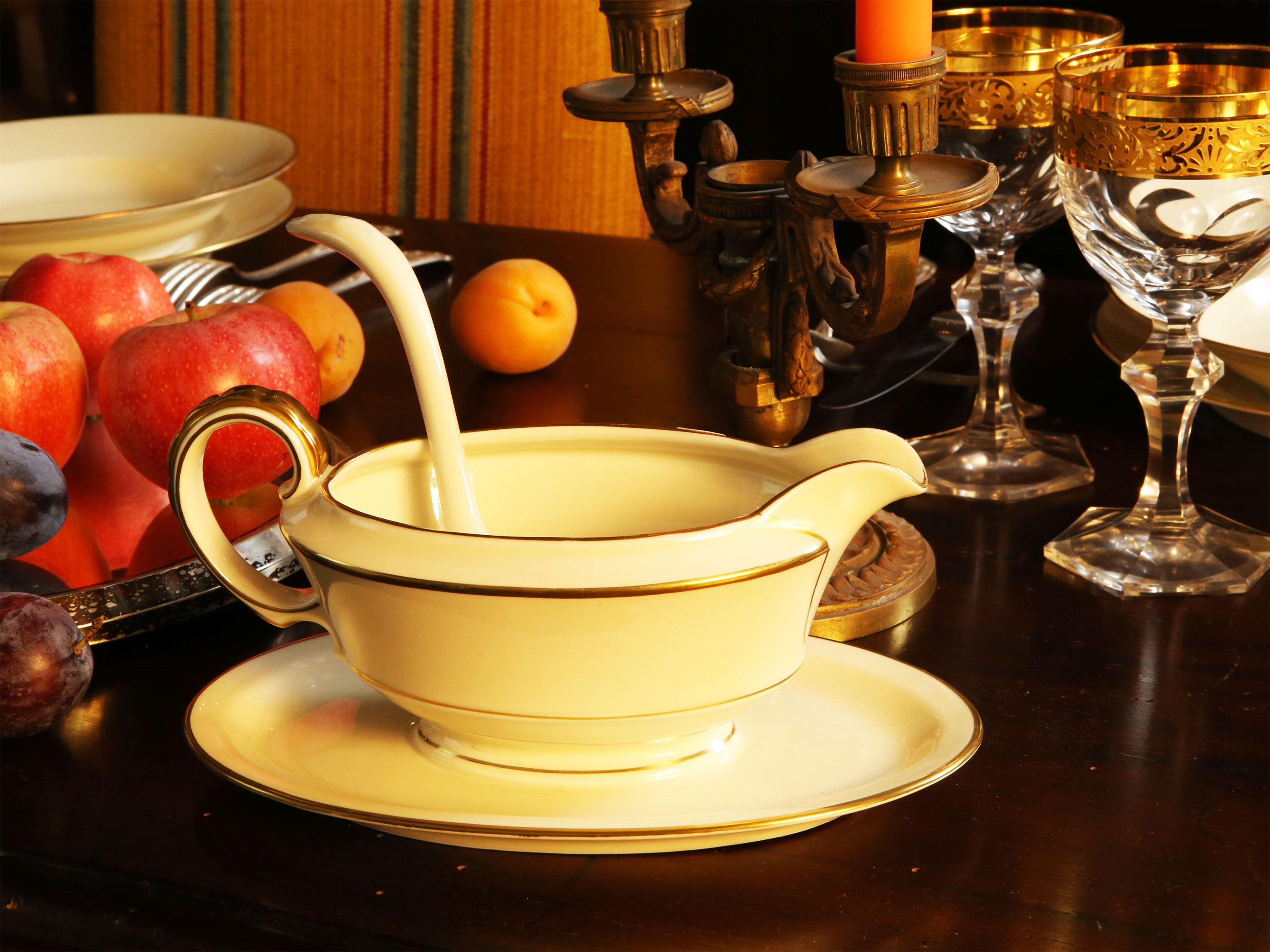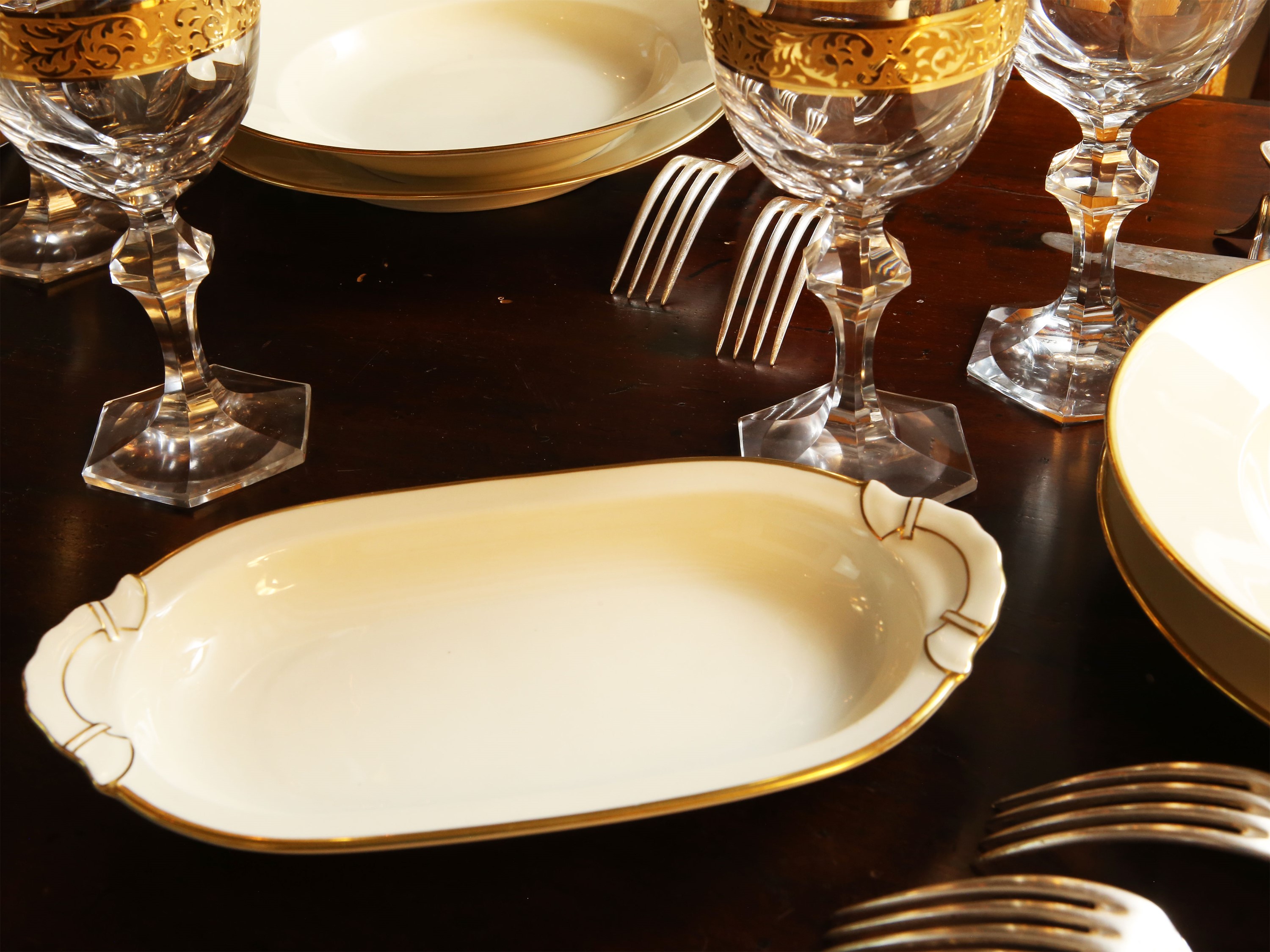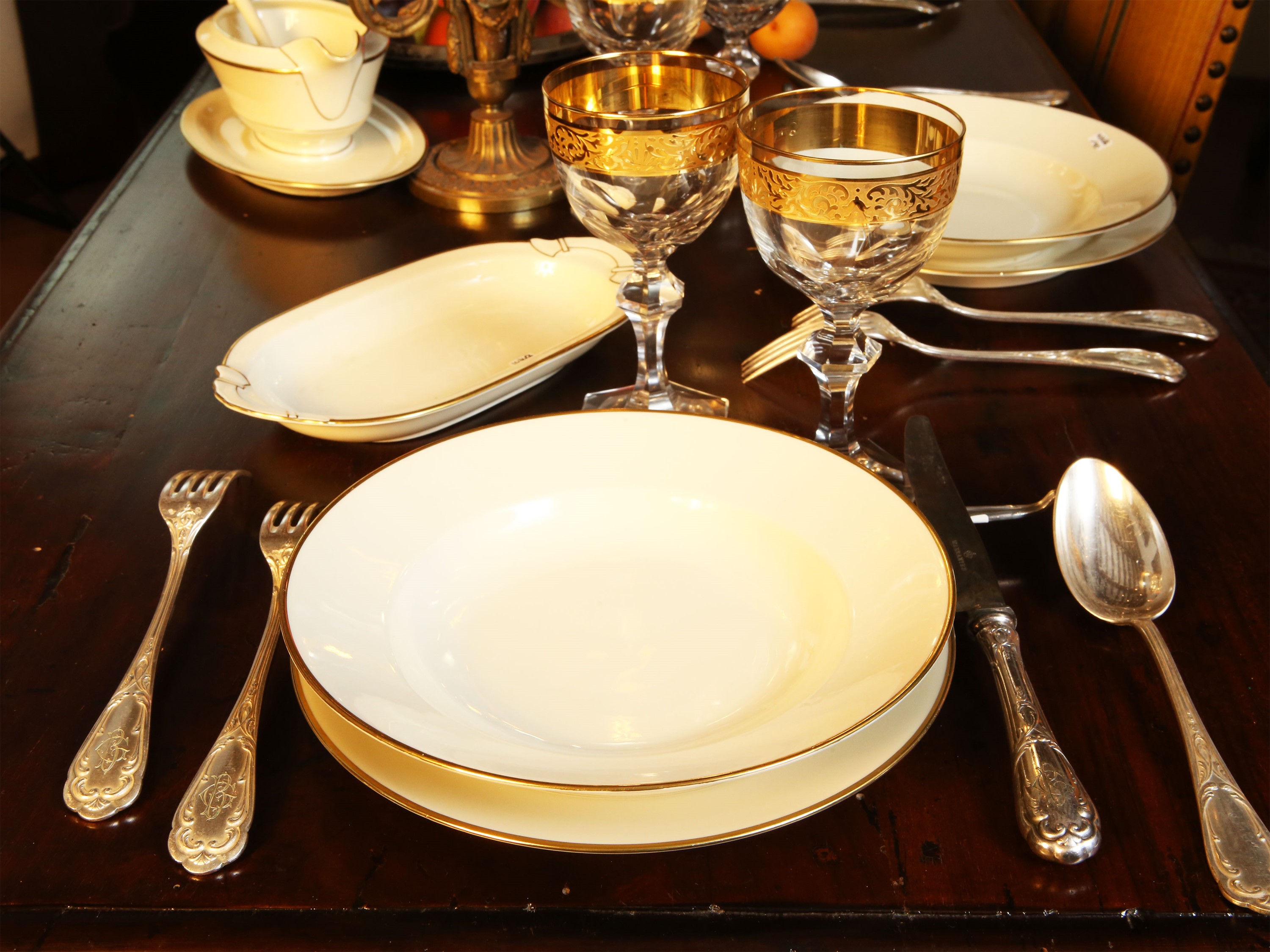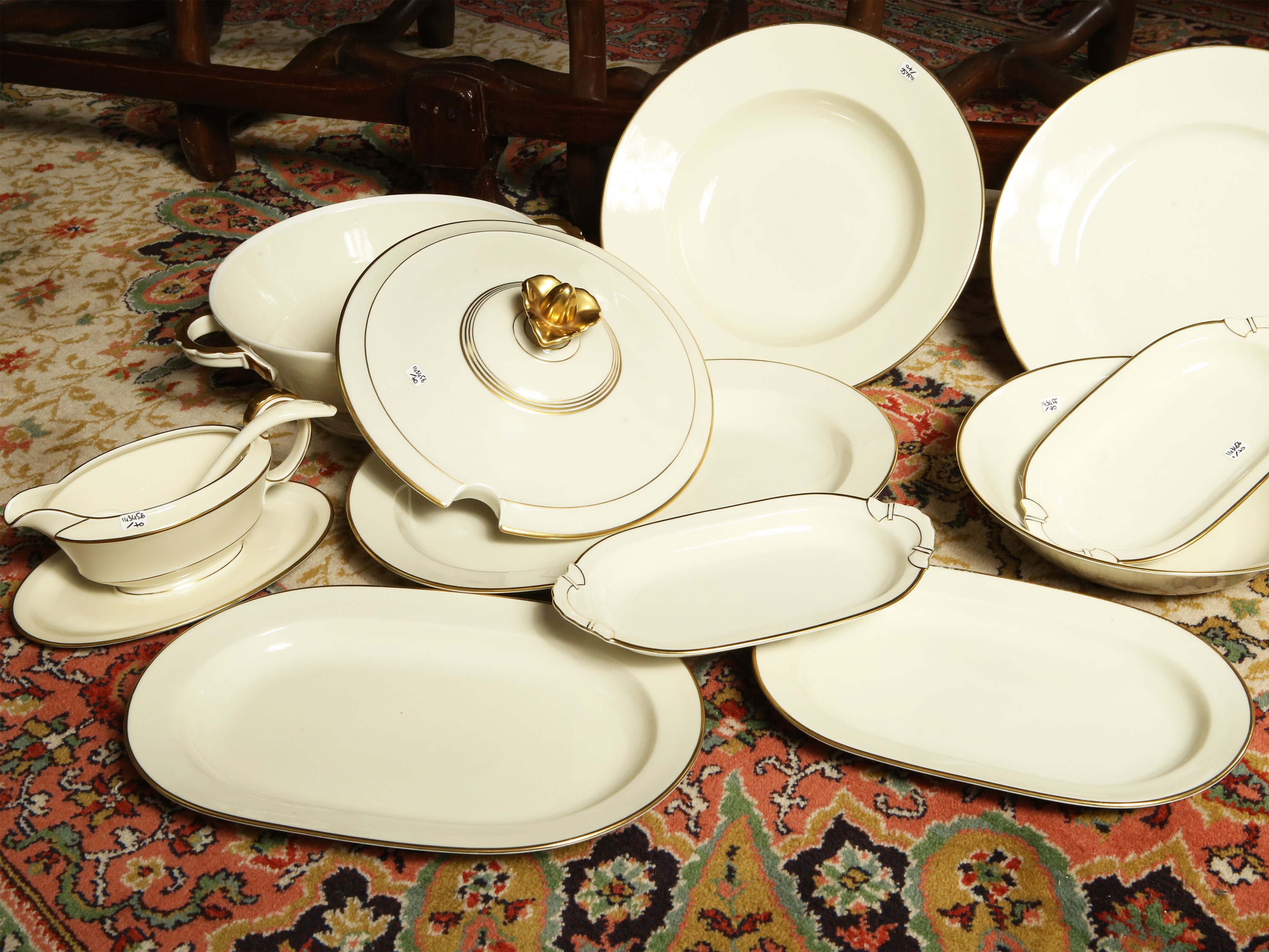 Anni Trenta-Quaranta lumeggiato in oro, composto da 36 piatti piani, 12 piatti fondi, 12 piattini da frutta, zuppiera, tre insalatiere, tre vassoi a scalare, due raviere, una salsiera e due alzatine