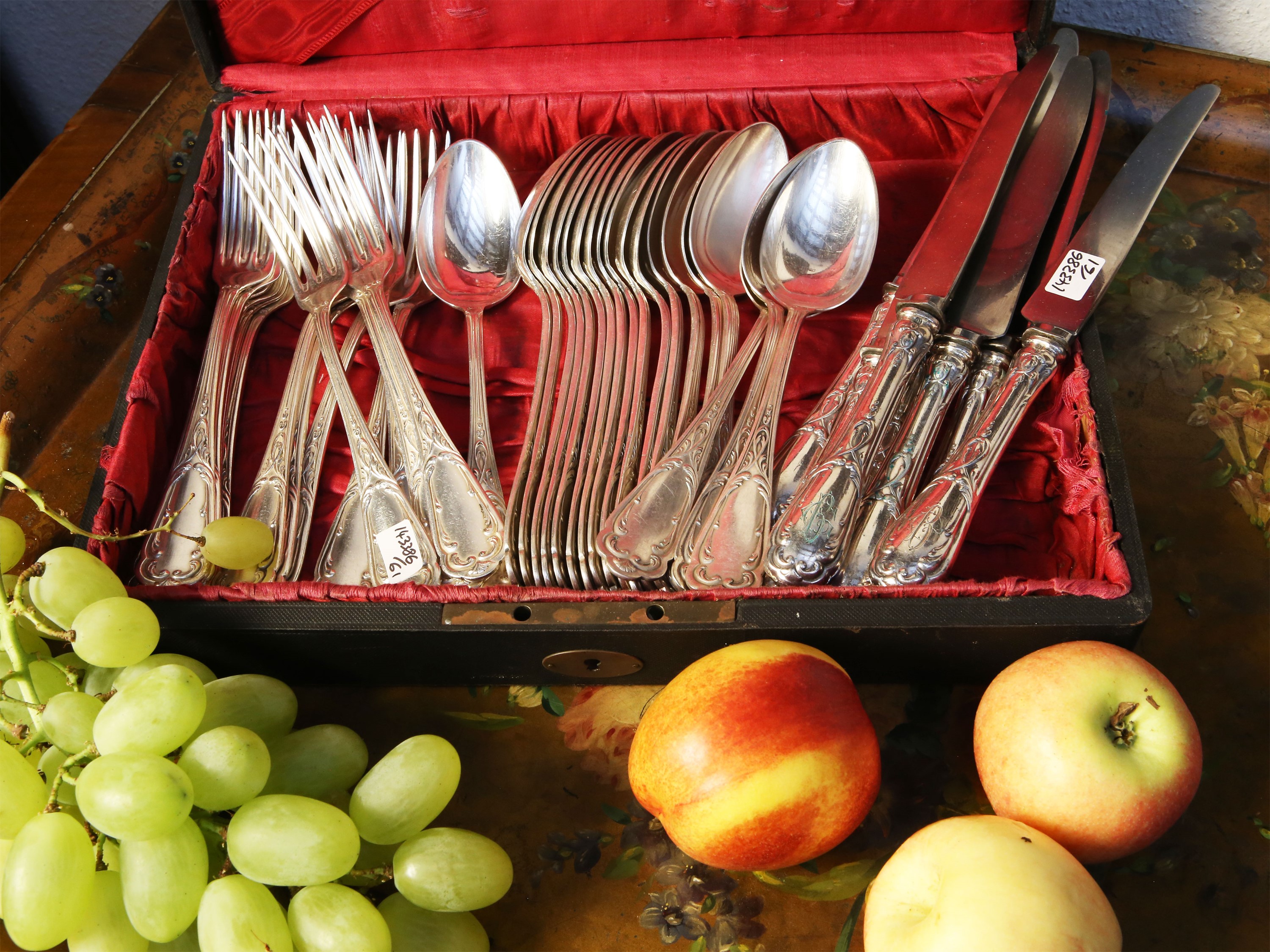 fine del XIX/inizio del XX secolo composto da 24 forchette, 24 cucchiai e 12 coltelli, contenuto in parte in una scatola d'epoca (60)