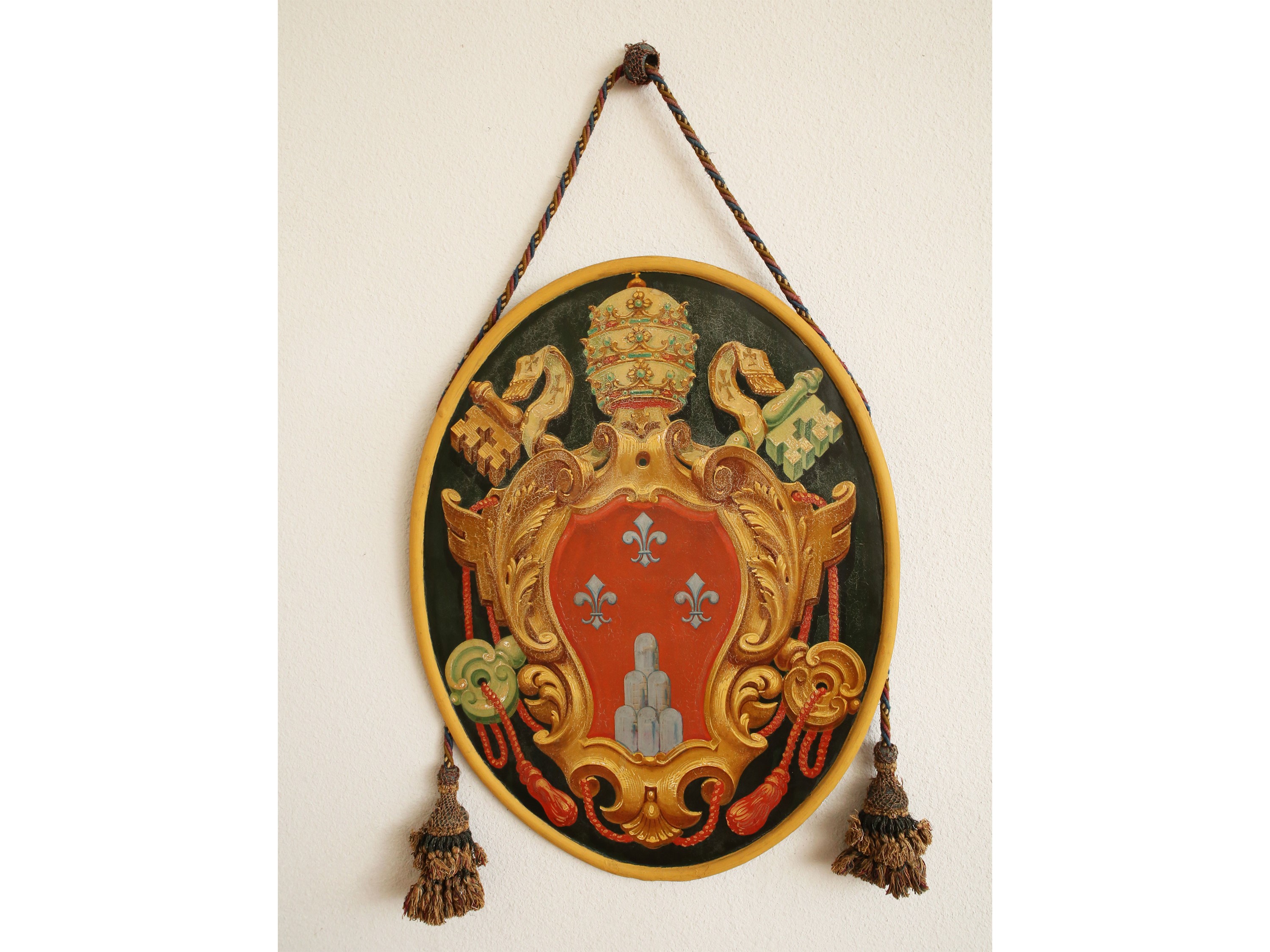 cm 90x69 Italia centrale, XX secolo di forma ovale, in metallo smaltato, verosimilmente realizzato al momento della sua elezione al soglio pontificio nel 1963 o in occasione dell'Anno Santo 1975, raffigurante, entro cartiglio mistilineo a volute e racemi d'acanto, il monte all'italiana di sei cime evocante il cognome Montini con in campo tre gigli male ordinati