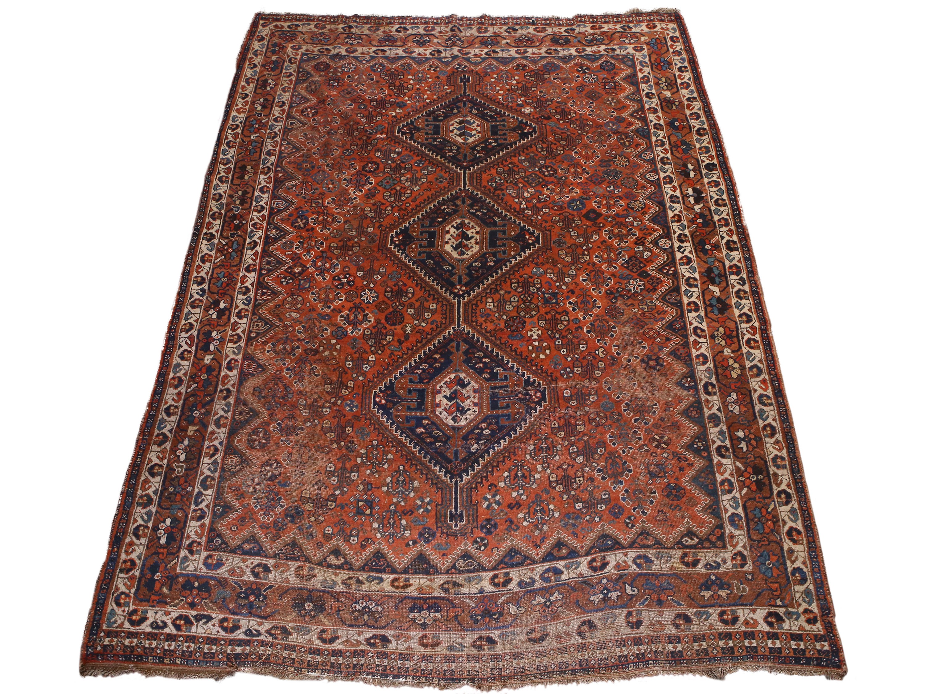 1925 con colori vegetali naturali, campo a motivo geometrico nei toni del rosso mattone ed arancio
