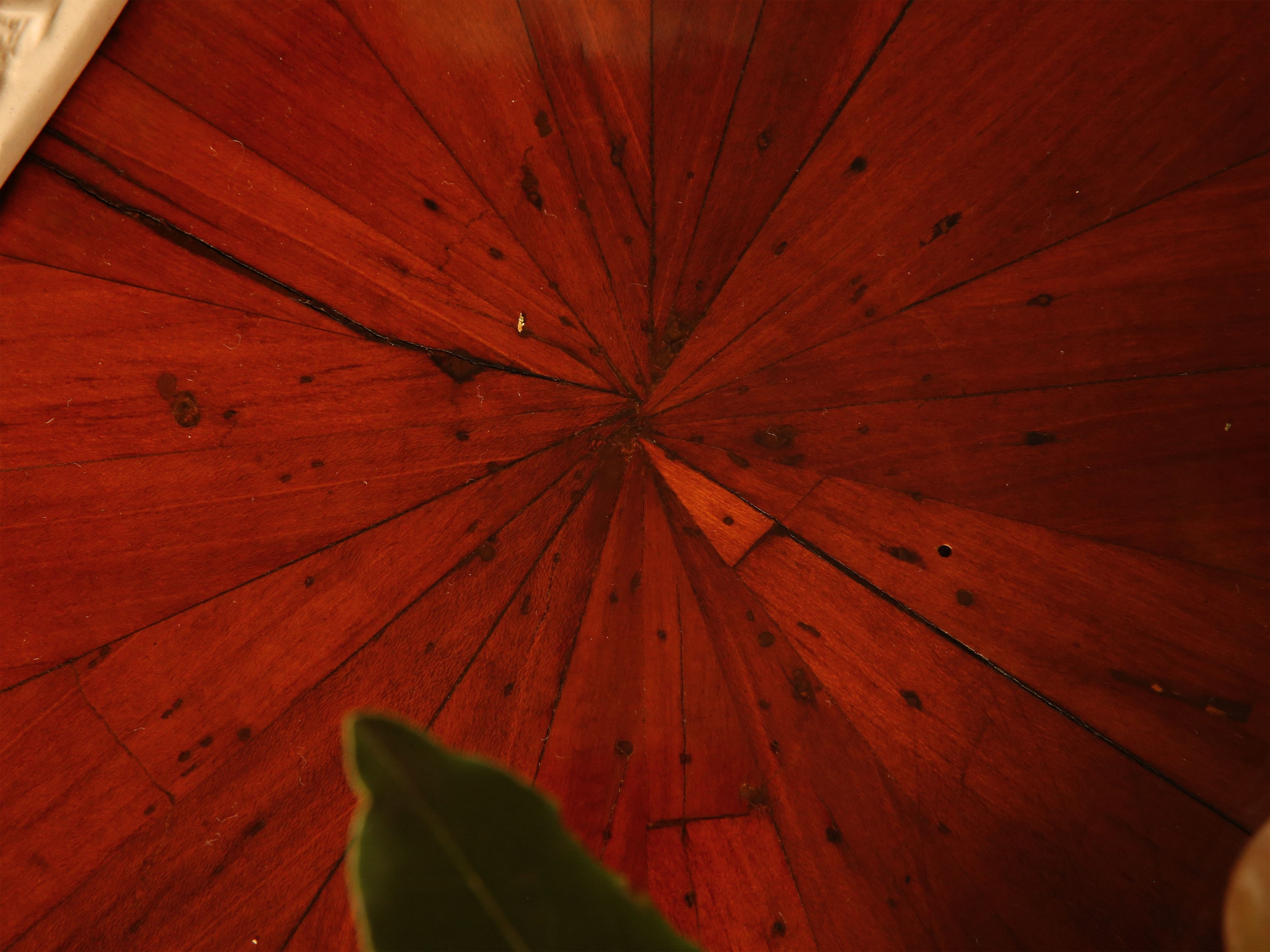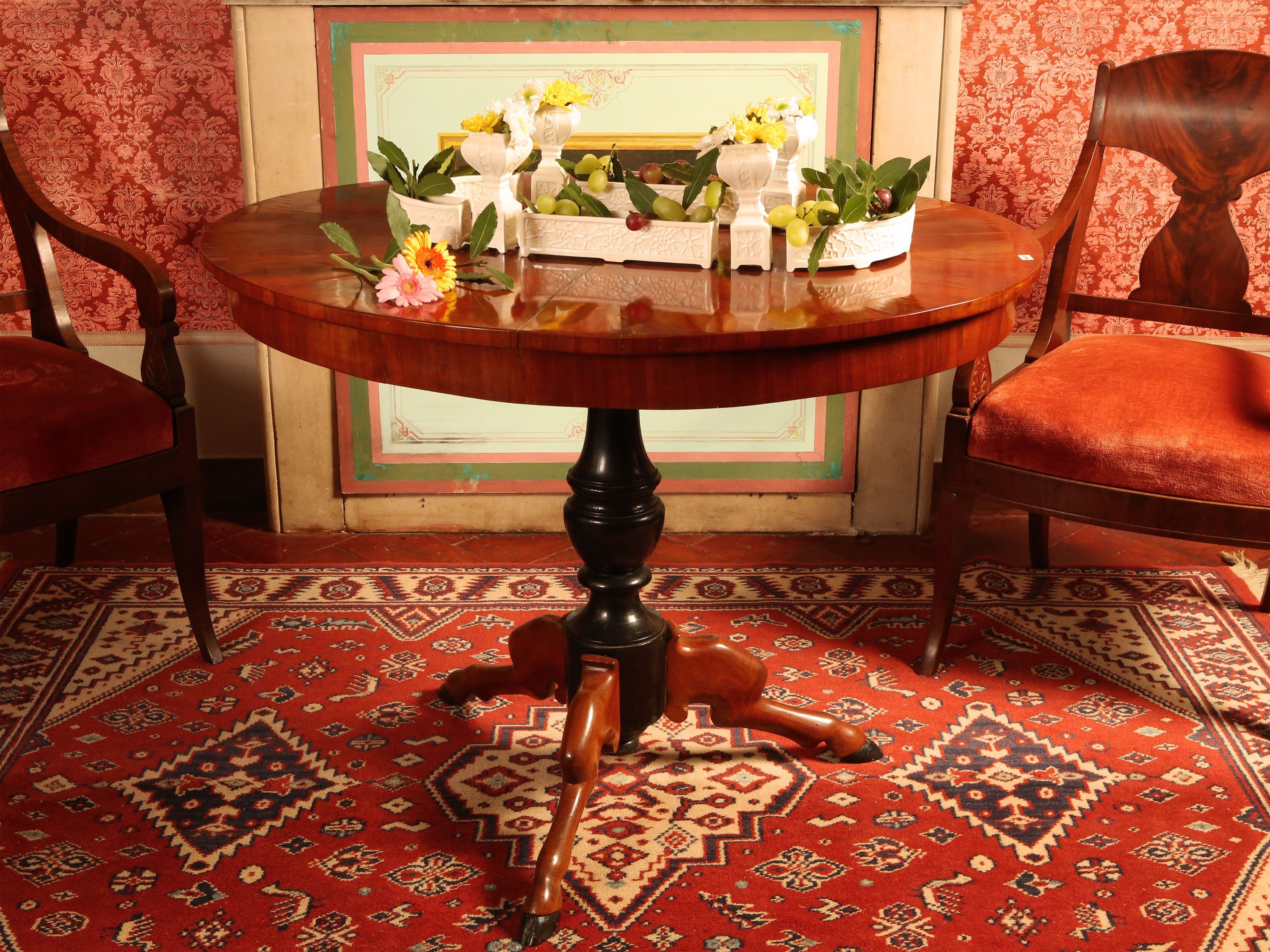 Emilia, prima metà del XIX secolo piano ovale intarsiato a spicchi, sostegno a vaso ebanizzato su tripode con piedini a zoccolo, lievi difetti