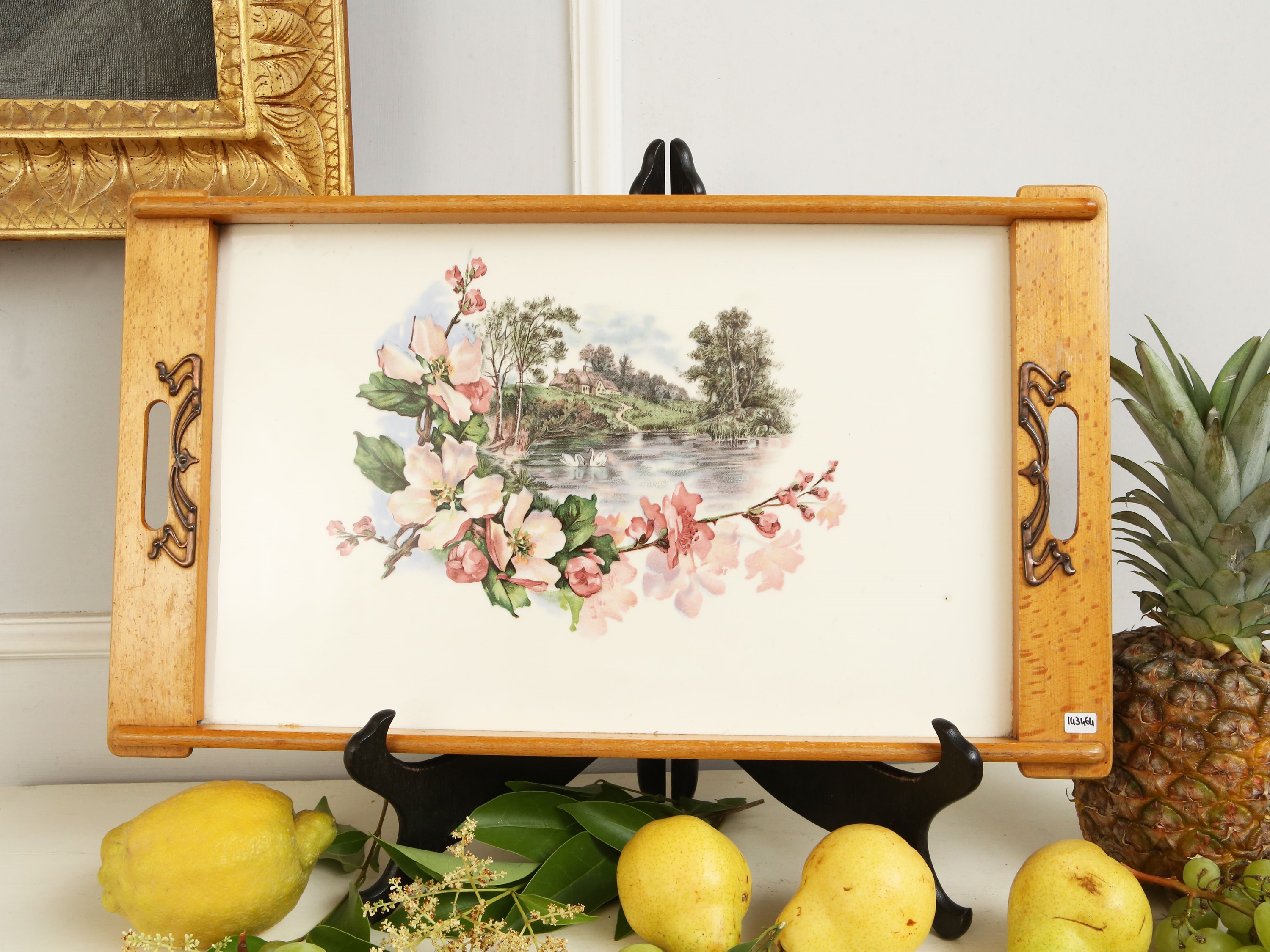 inizio del XX secolo dipinto con un paesaggio circondato da tralcio di fiori di pesco