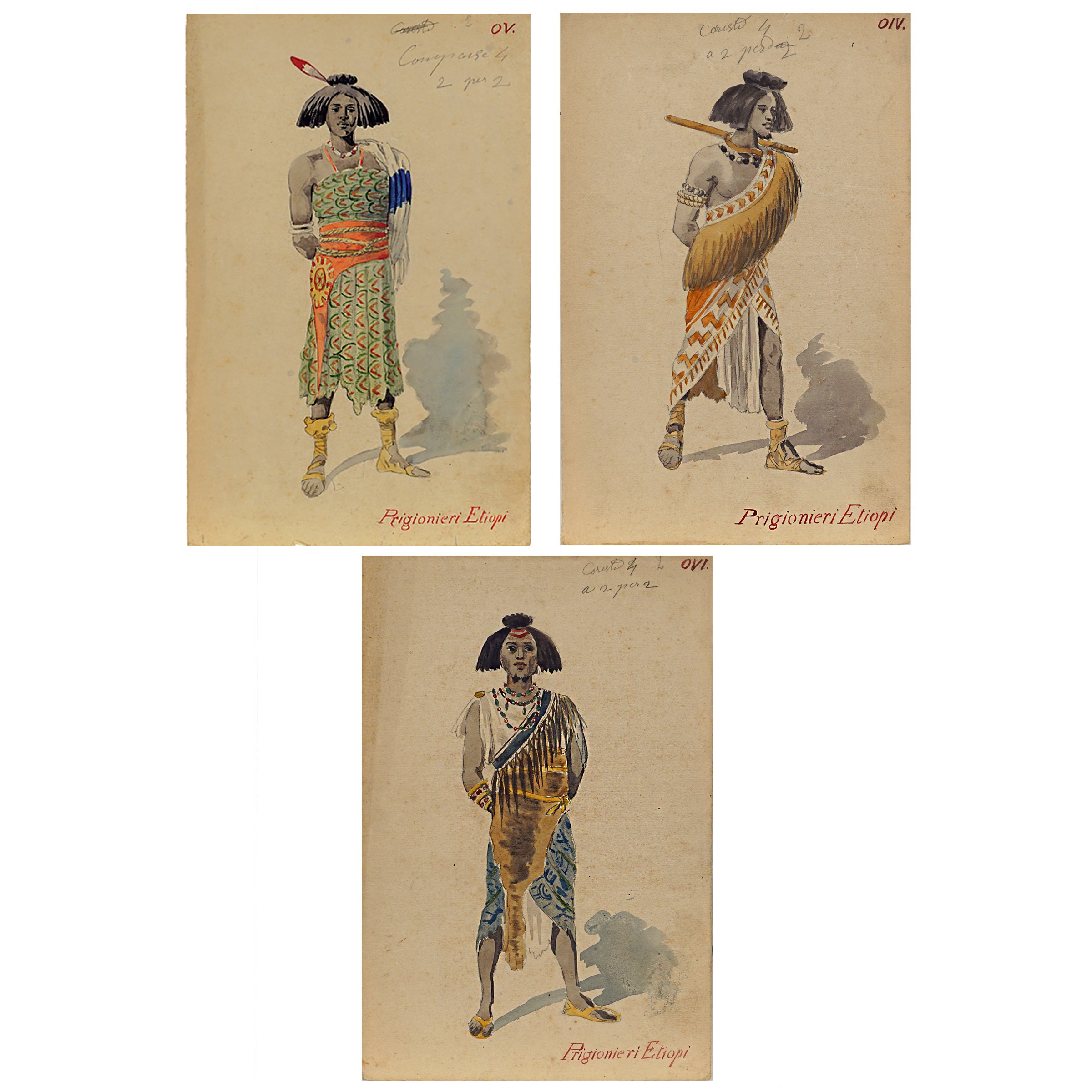 Italia, 1904 circa Prigionieri e prigioniere Etiopi, 3 figurini per la rappresentazione dell'opera Aida di Giuseppe Verdi su libretto di Antonio Ghislanzoni, tecniche miste su carta, numerati in alto a sinistra, difetti