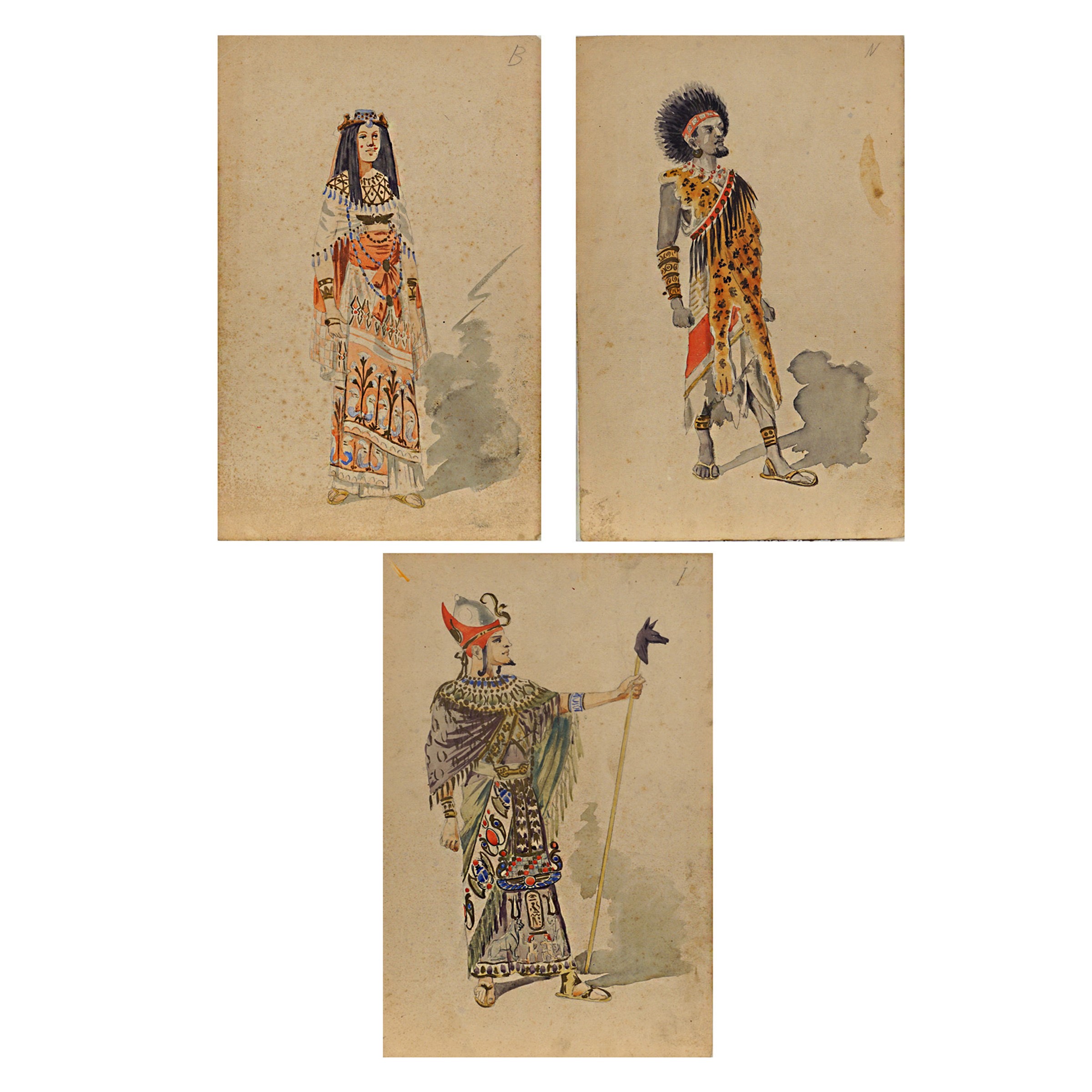 Italia, 1904 circa 3 figurini per la rappresentazione dell'opera Aida di Giuseppe Verdi su libretto di Antonio Ghislanzoni, tecnica mista su carta, difetti