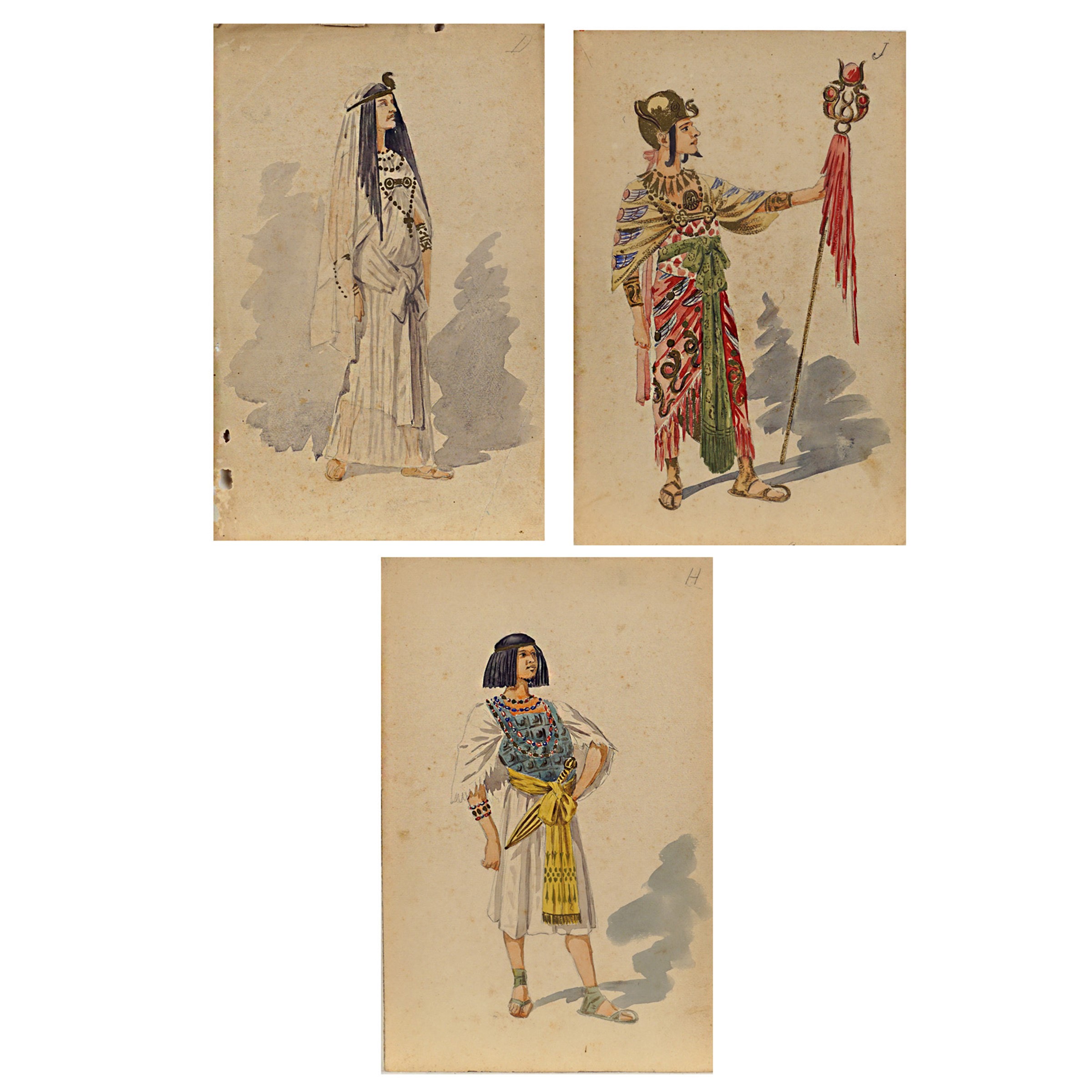 Italia, 1904 circa 3 figurini per la rappresentazione dell'opera Aida di Giuseppe Verdi su libretto di Antonio Ghislanzoni, tecnica mista su carta, difetti