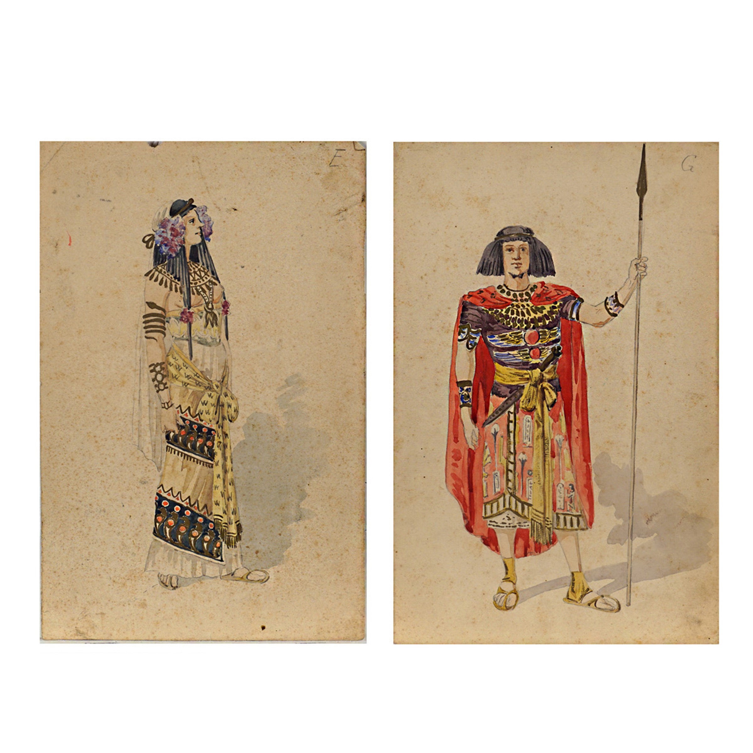 Italia, 1904 circa 2 figurini per la rappresentazione dell'opera Aida di Giuseppe Verdi su libretto di Antonio Ghislanzoni, tecnica mista su carta, difetti