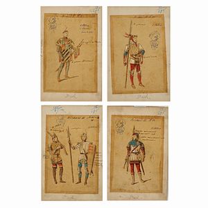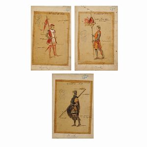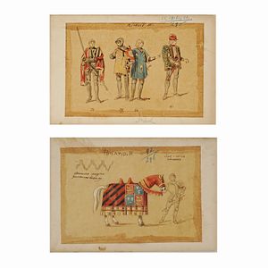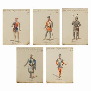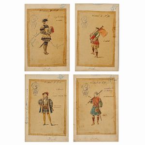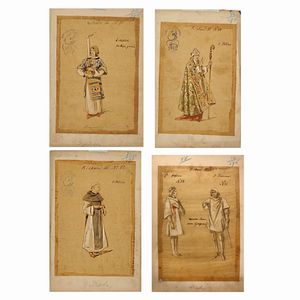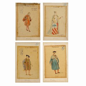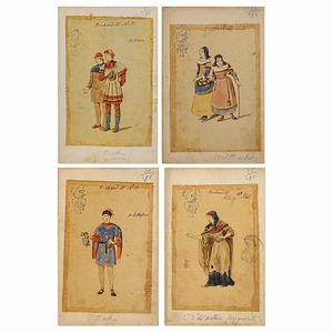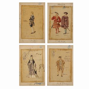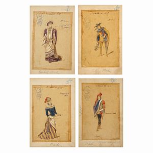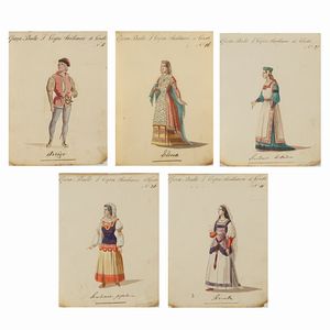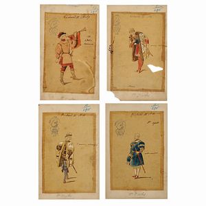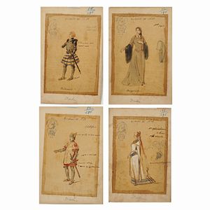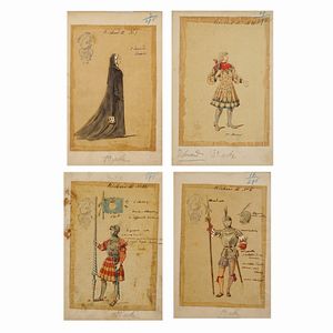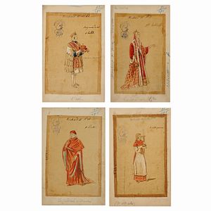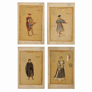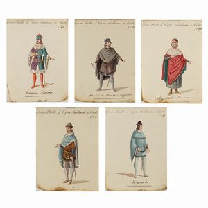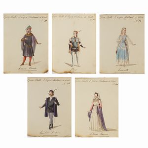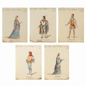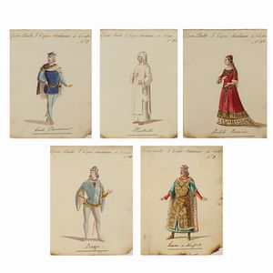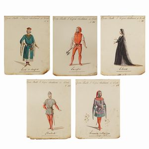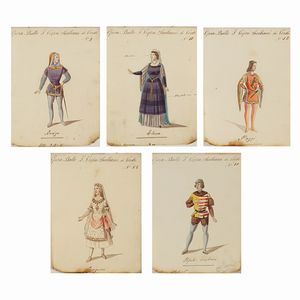 29x23 cm. Italia, 1900 circa 5 figurini per la rappresentazione dell'opera di Giuseppe Verdi, tecnica mista su [..]