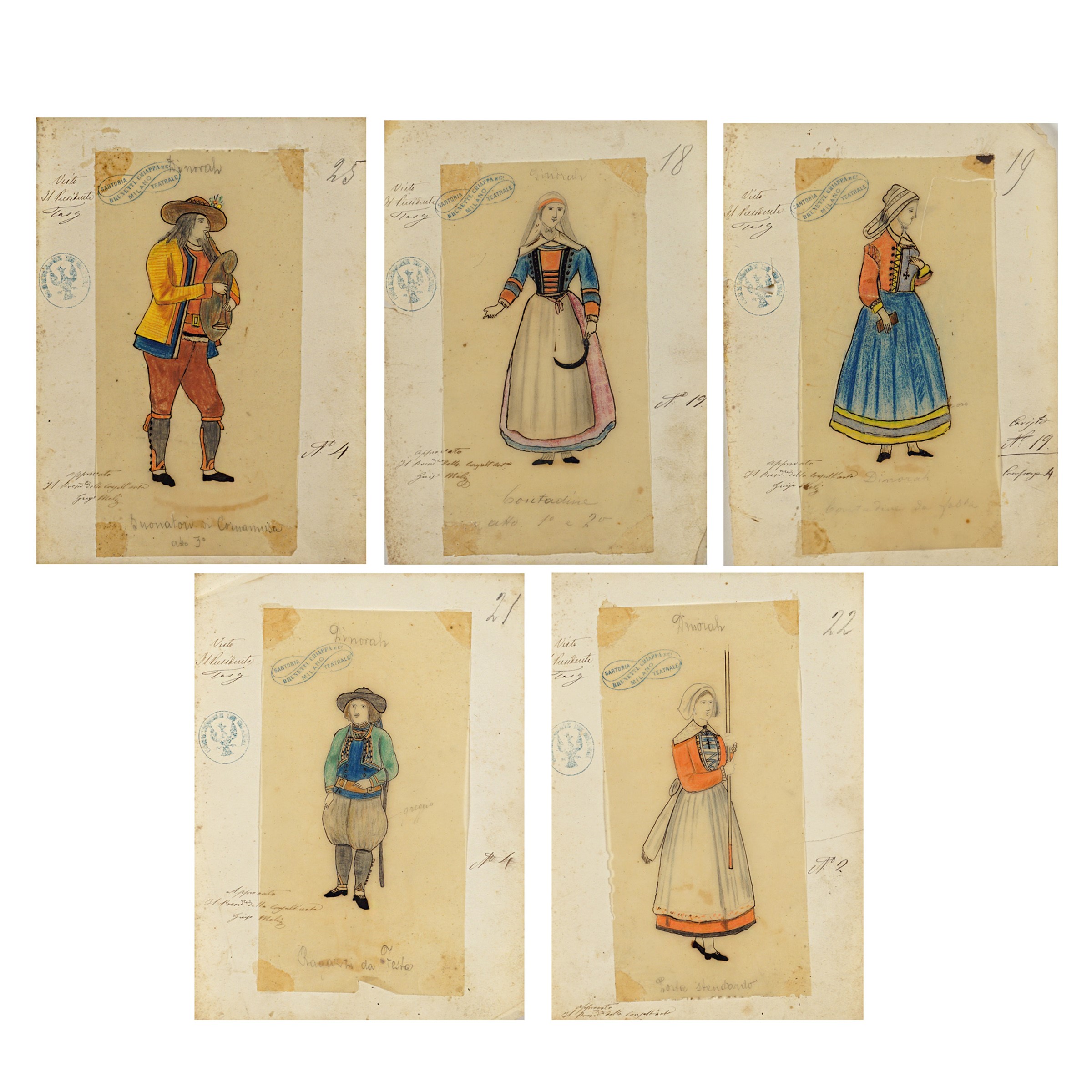Milano, 1900 circa 5 figurini per la rappresentazione dell'opera di Giacomo Meyerbeer, tecnica mista su carta, difetti