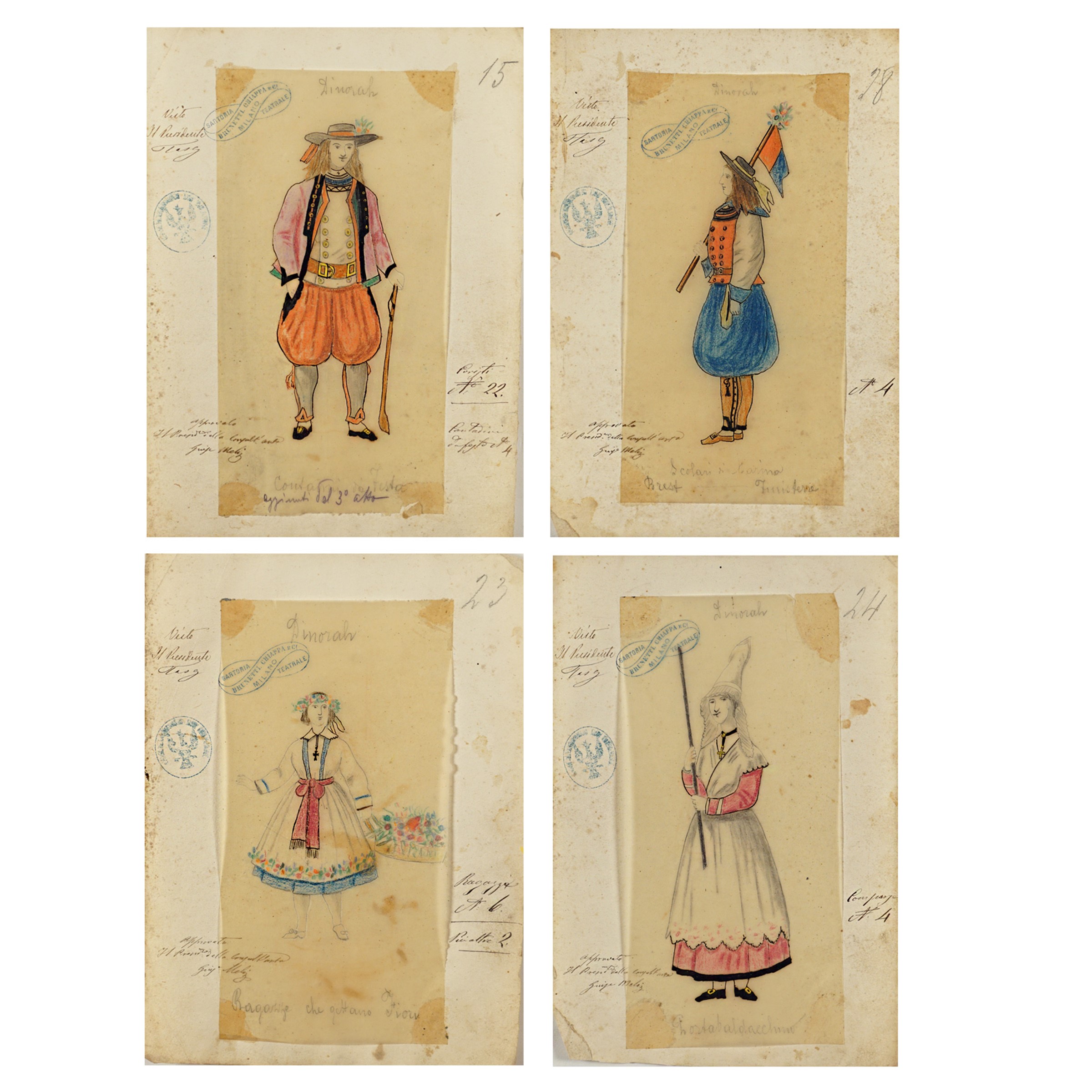 Milano, 1900 circa 4 figurini per la rappresentazione dell'opera di Giacomo Meyerbeer, tecnica mista su carta, difetti