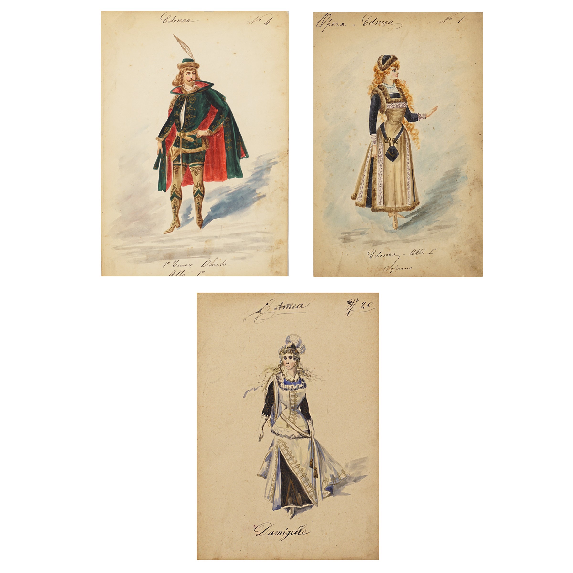 Milano, 1900 circa 3 figurini per la rappresentazione dell'opera di Alfredo Catalani, tecnica mista su carta, difetti