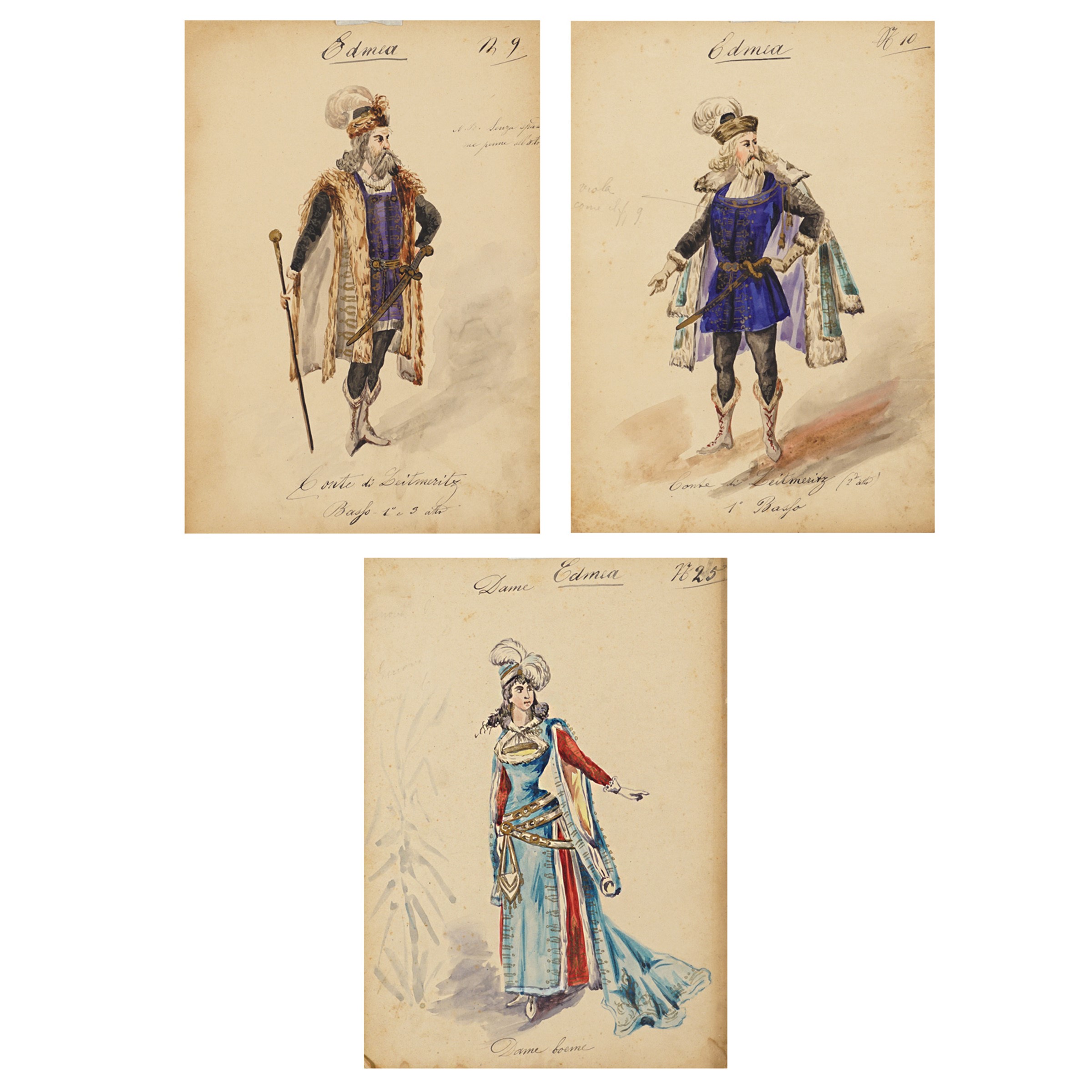 Milano, 1900 circa 3 figurini per la rappresentazione dell'opera di Alfredo Catalani, tecnica mista su carta, difetti