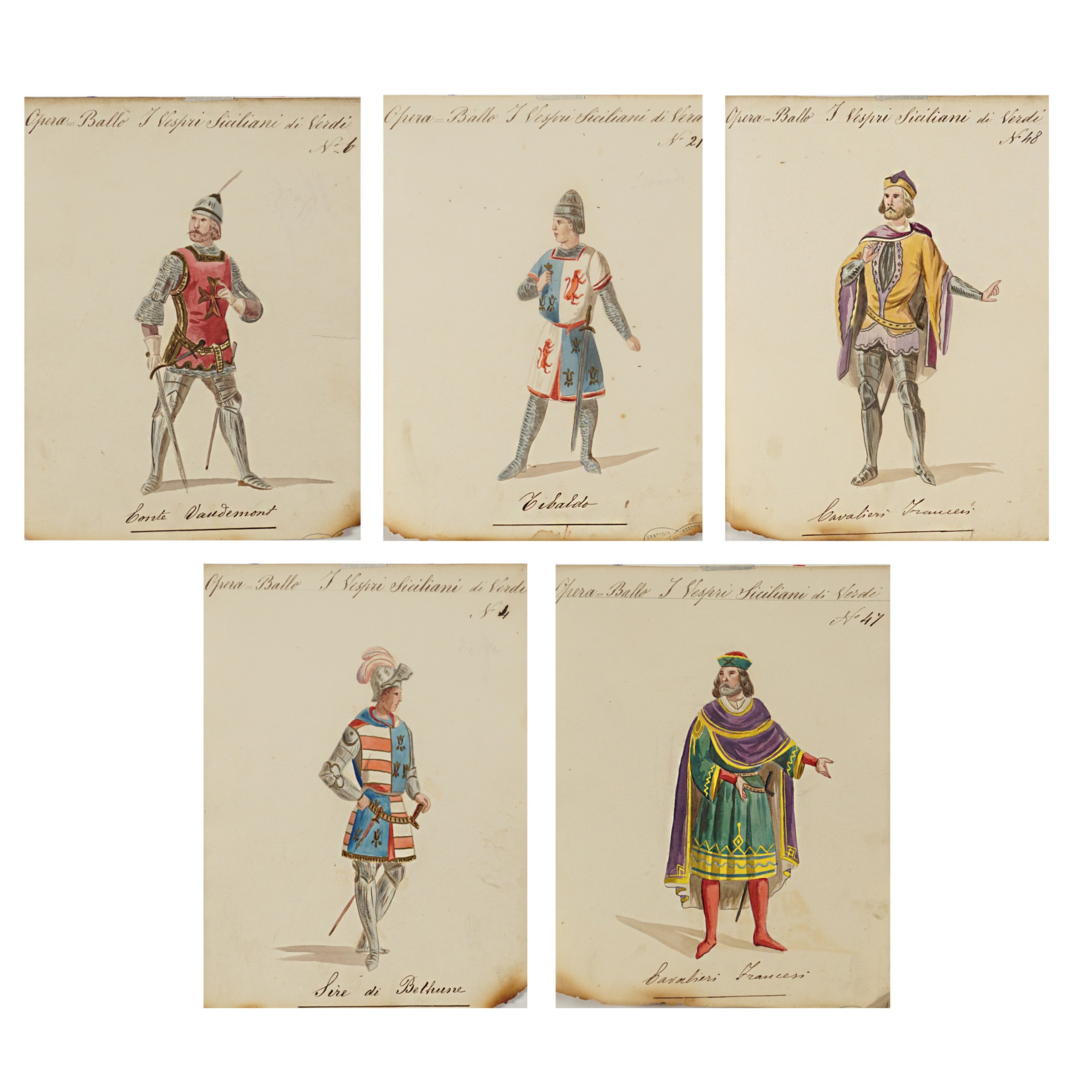 Italia, 1900 circa 5 figurini per la rappresentazione dell'opera di Giuseppe Verdi, tecnica mista su carta, difetti