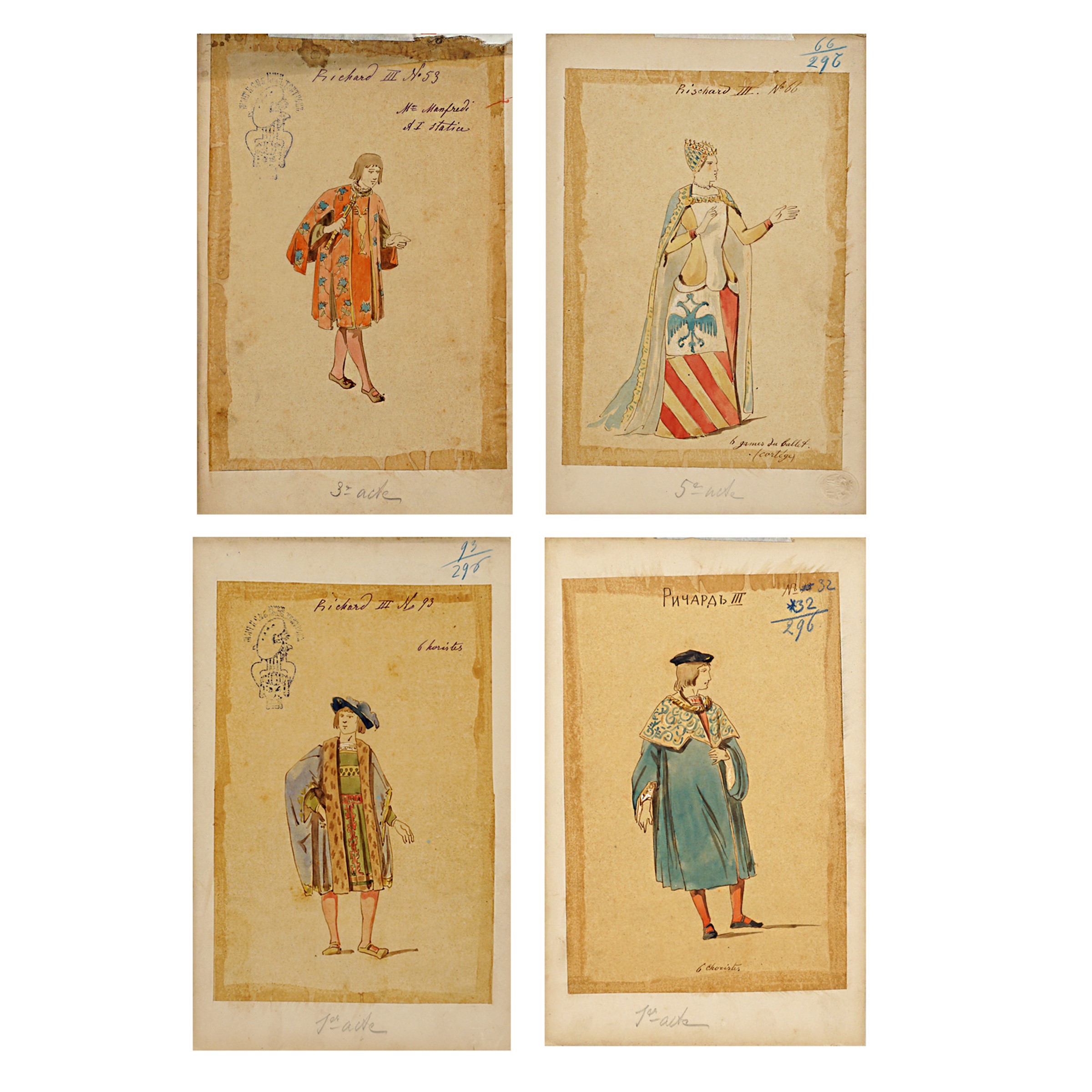 Italia, 1900 circa 4 figurini per la rappresentazione dell'opera di William Shakespeare, tecnica mista su carta velina applicata su cartoncino, difetti