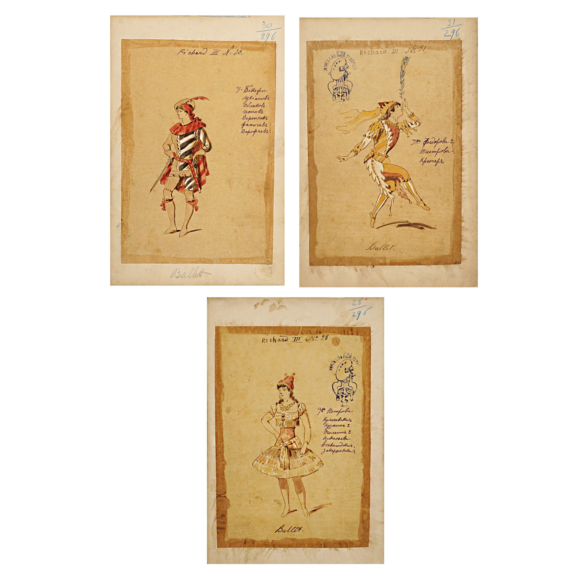 Italia, 1900 circa 3 figurini per la rappresentazione dell'opera di William Shakespeare, tecnica mista su carta velina applicata su cartoncino, difetti