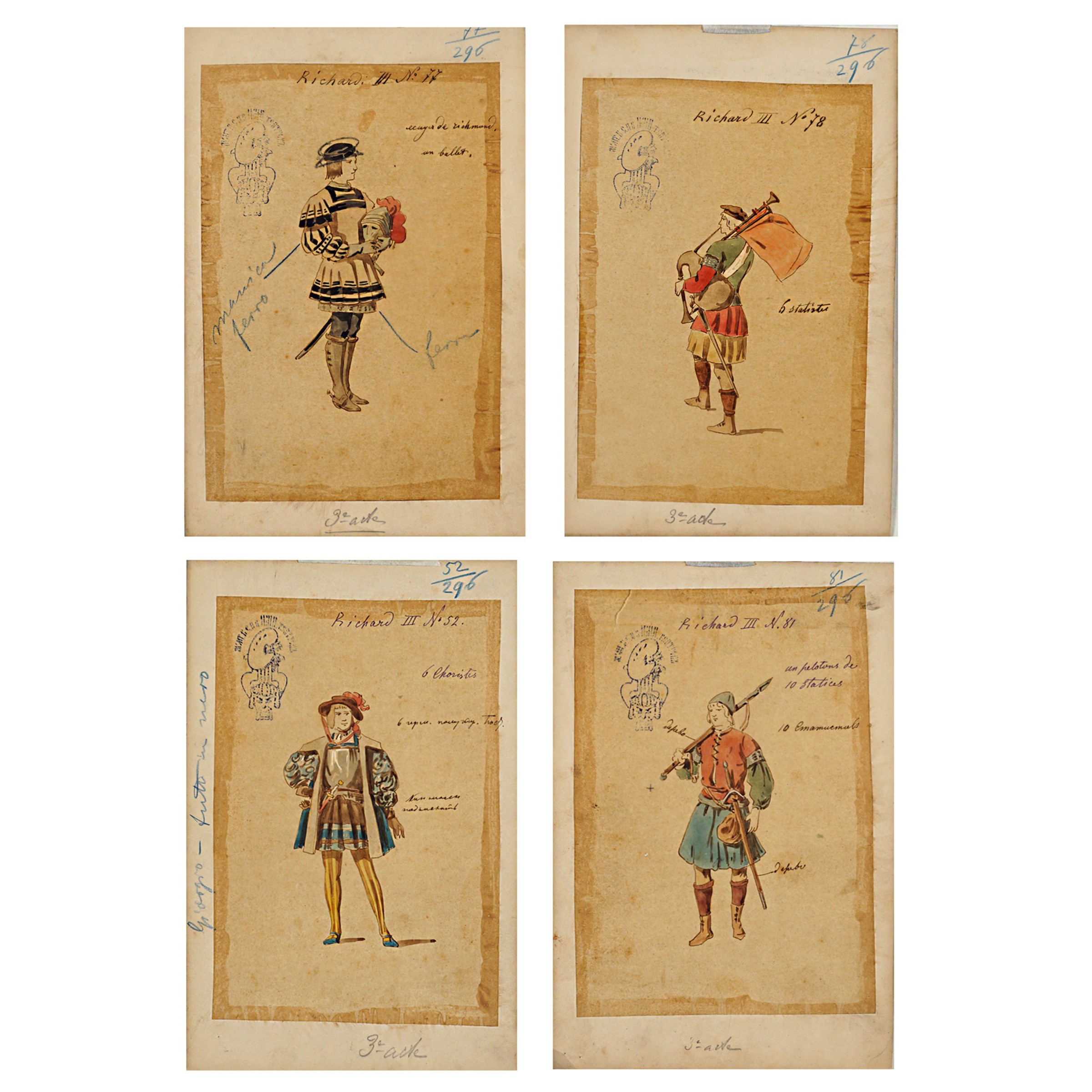 Italia, 1900 circa 4 figurini per la rappresentazione dell'opera di William Shakespeare, tecnica mista su carta velina applicata su cartoncino, difetti