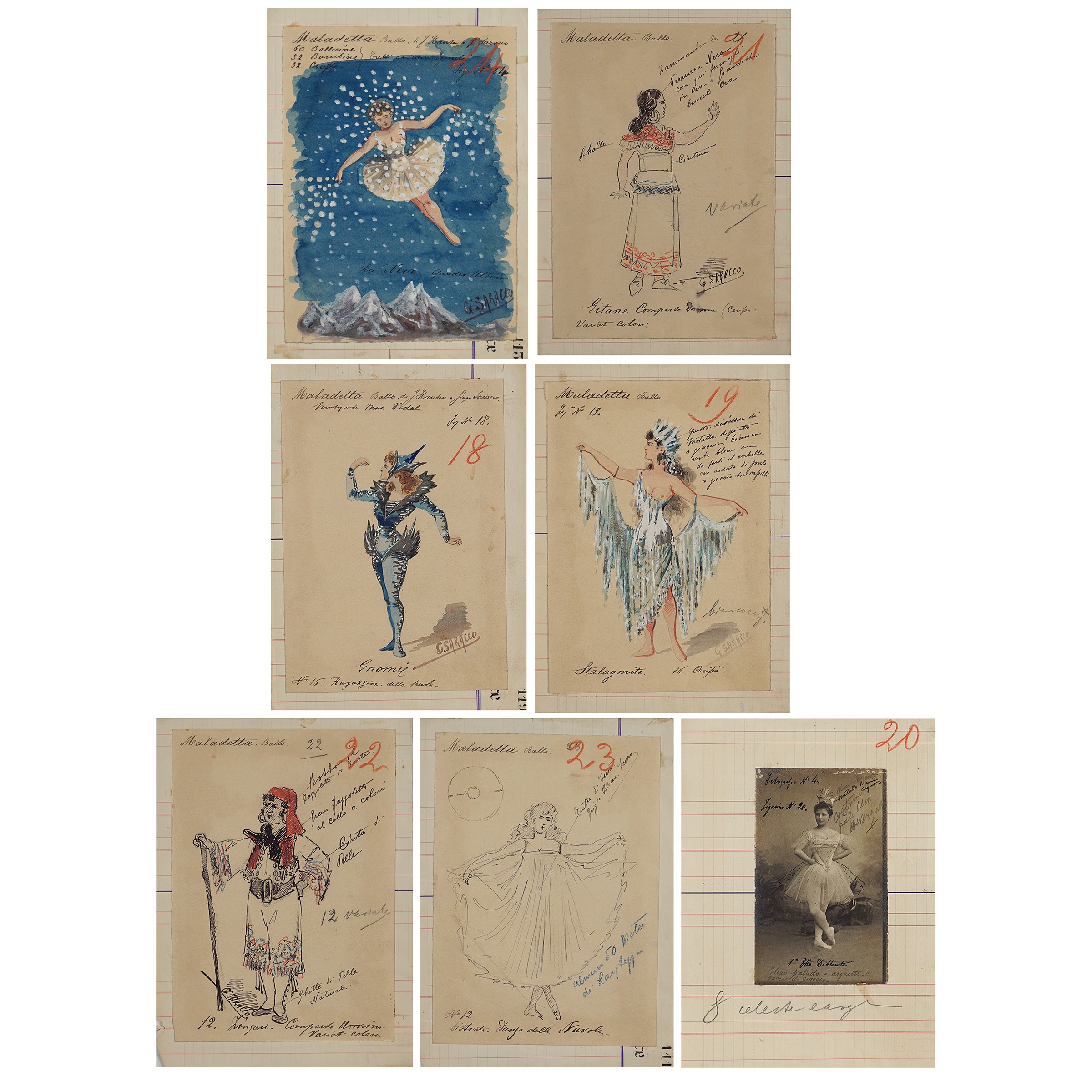 29,5x21,5 cm. Italia, XIX - XX Sec. 6 figurini e una fotografia ritoccata per la rappresentazione del ballo La Maladetta di Pedro Gailhard, musica di Paolo Vidal, tempera, tecnica mista su carta applicata su fogli di quaderno, cinque firmati G. Saracco in basso a destra, difetti