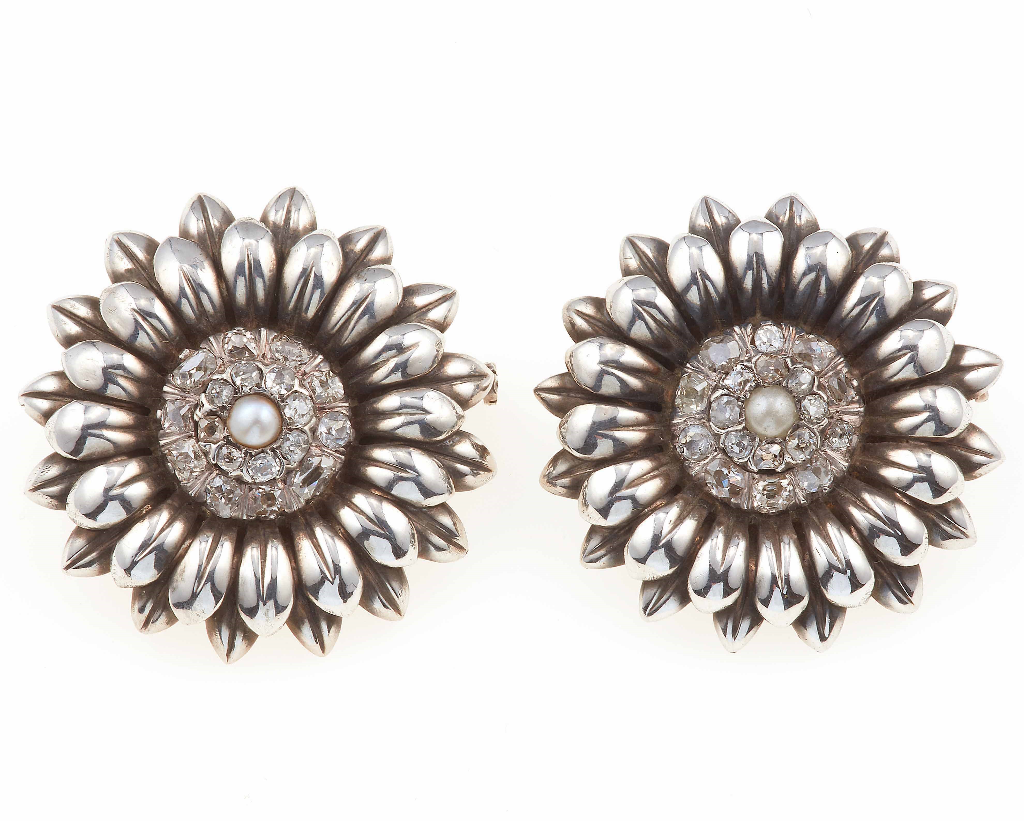 Coppia di spille a soggetto floreale con piccoli diamanti di vecchio taglio e pe [..]