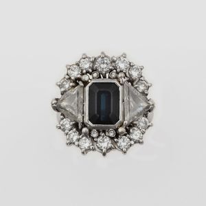 Anello con spinello blu, piccoli rubini e diamanti taglio a rosa