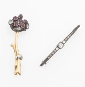 Coppia di spille a soggetto floreale con piccoli diamanti di vecchio taglio e pe [..]