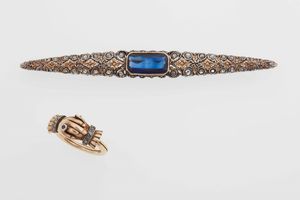 Lotto composto da due spille con diamanti, uno zaffiro e perline