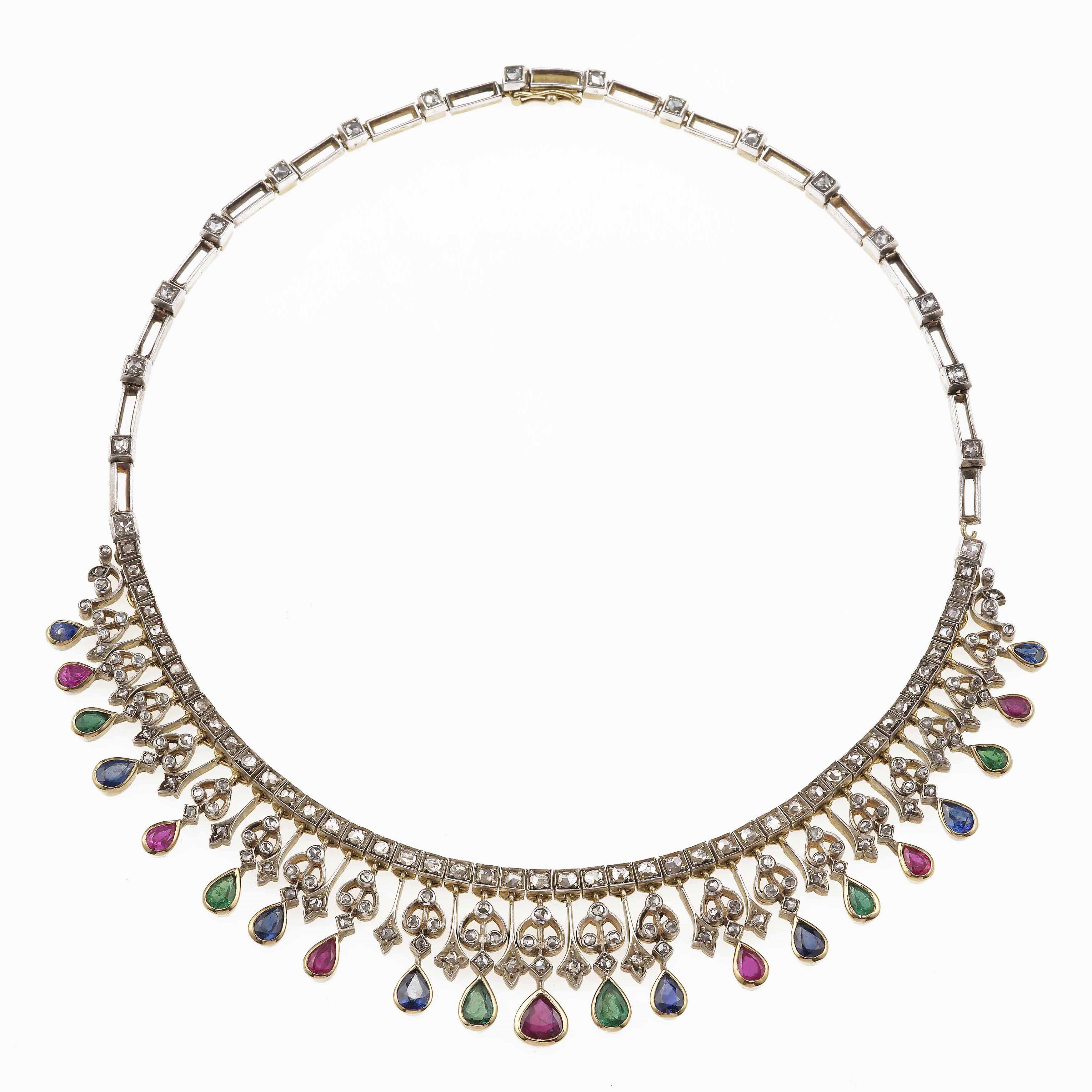 Girocollo con diamanti taglio a rosa e rubini, smeraldi e zaffiri taglio goccia