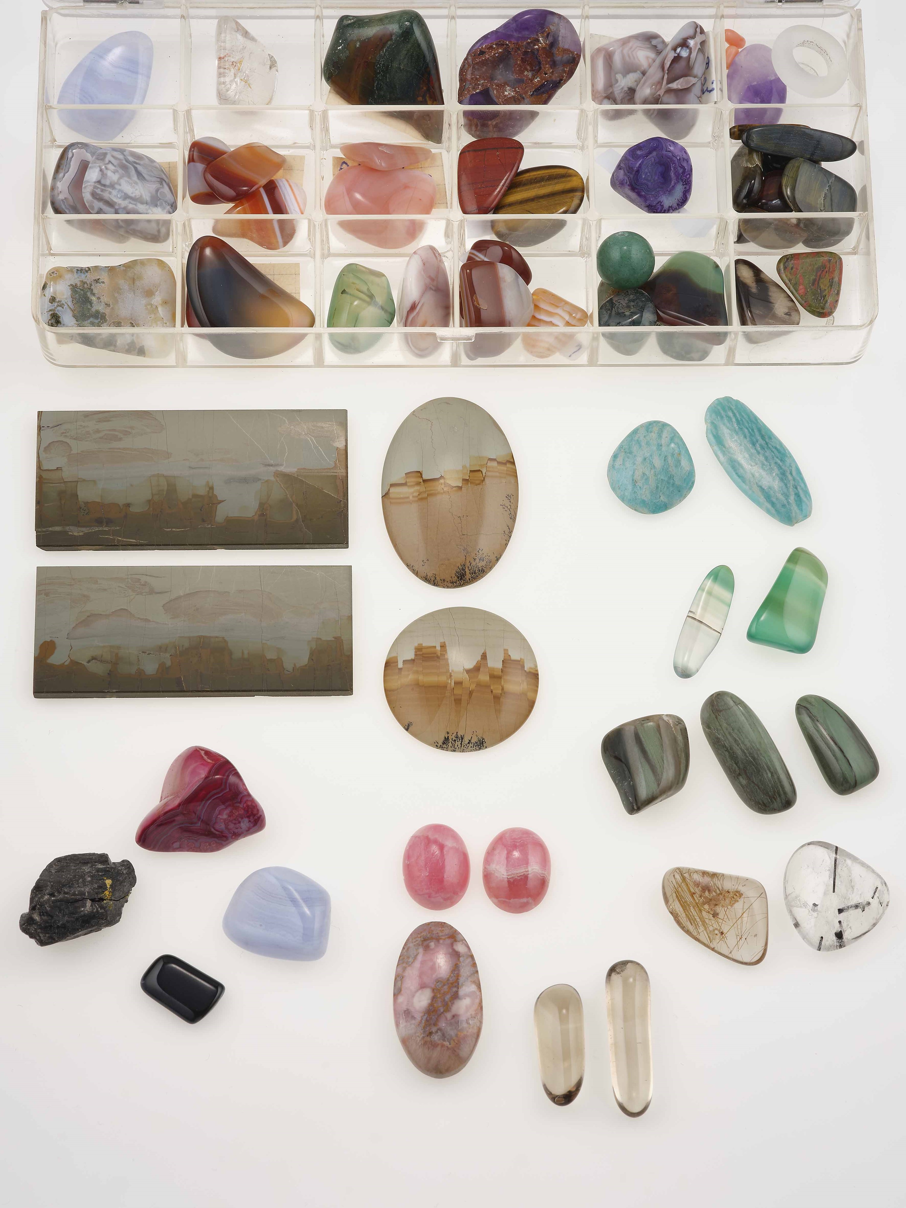 Grande lotto composto da pietre dure matriali vari, gemme sintetiche montate e smontate, [..]