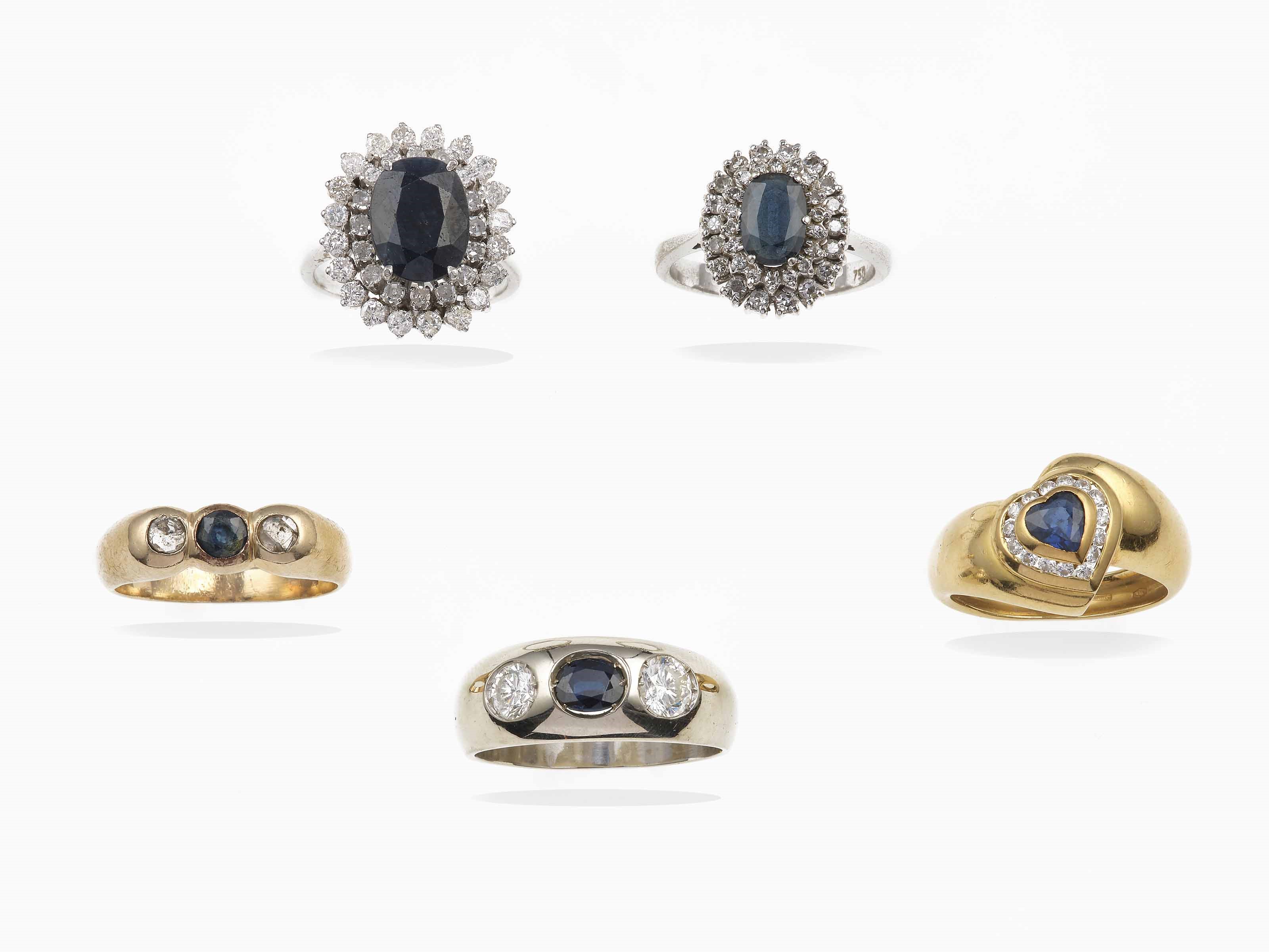 Lotto composto da cinque anelli con zaffiri naturali e sintetici e diamanti