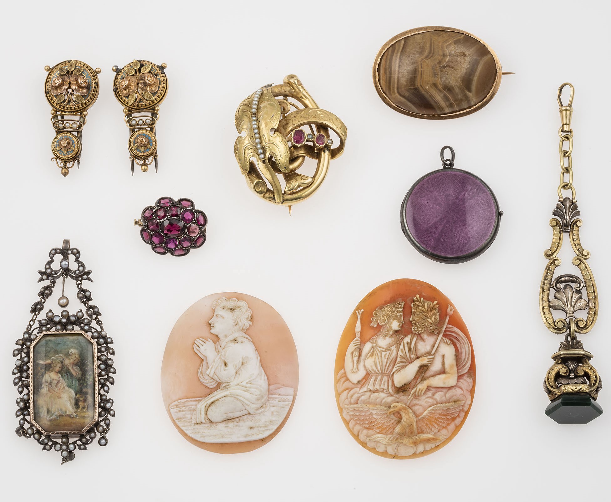 Lotto composto da due cammei, tre spille, un sigillo, due pendenti ed un paio di [..]