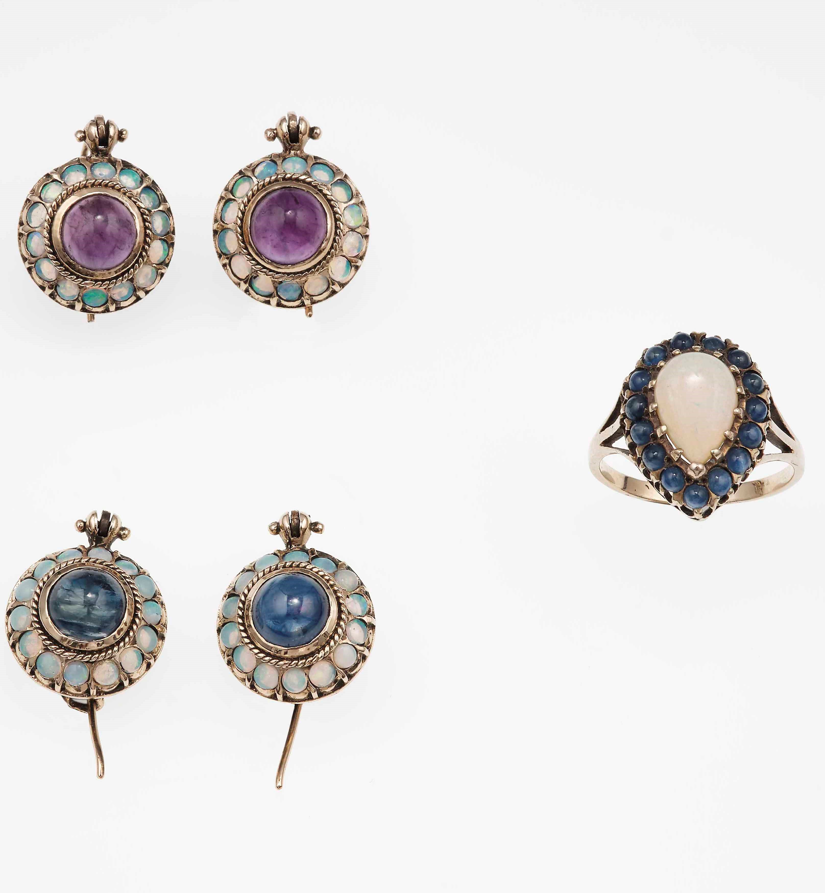 Lotto composto da due paia di orecchini ed un anello con opali, ametiste e zaffi [..]