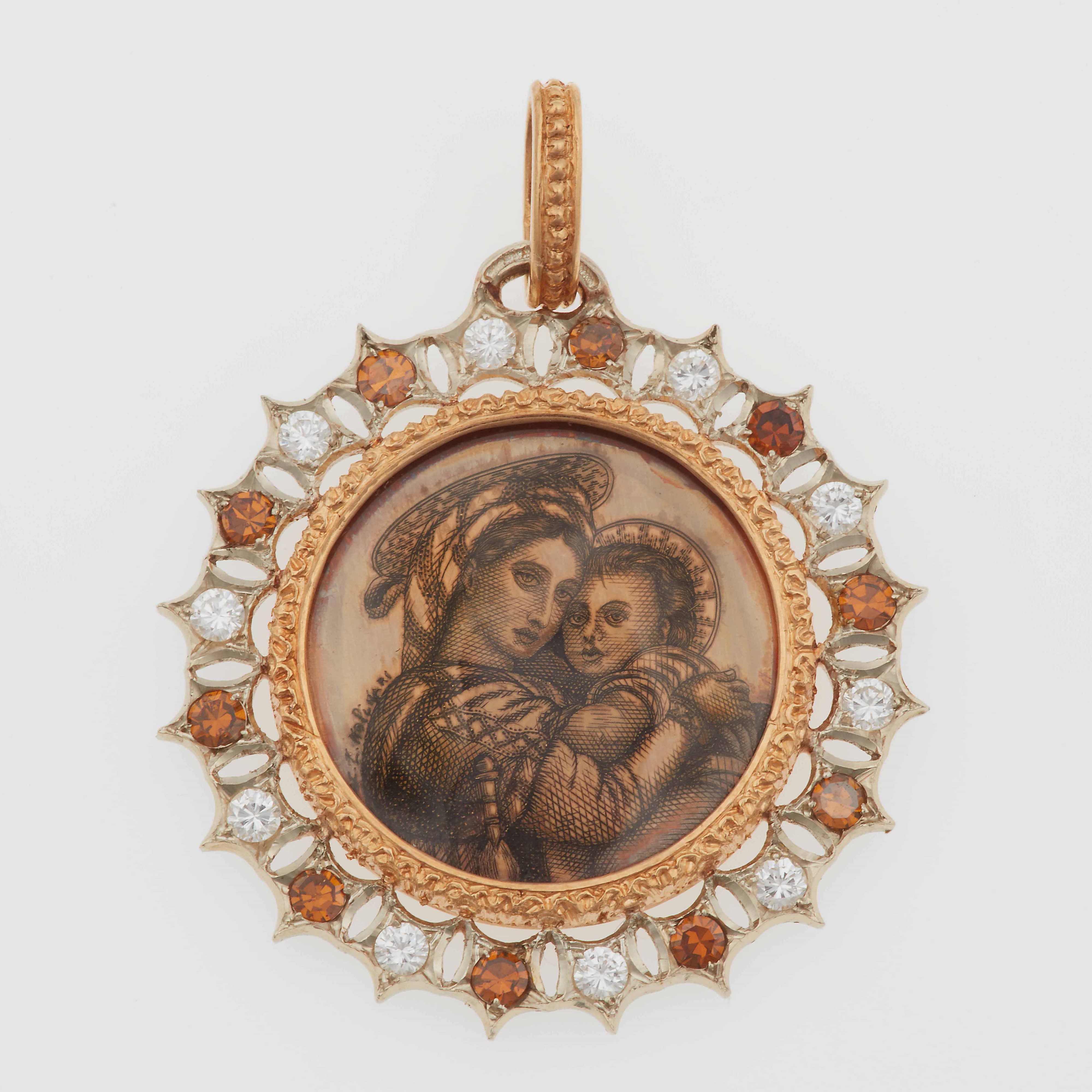 Pendente raffigurante Madonna con bambino, diamanti a contorno