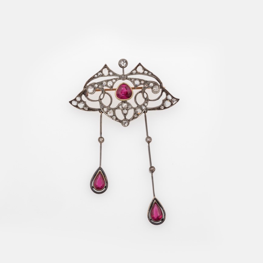 Pendente/spilla con pietre sintetiche rosse e rose di diamanti