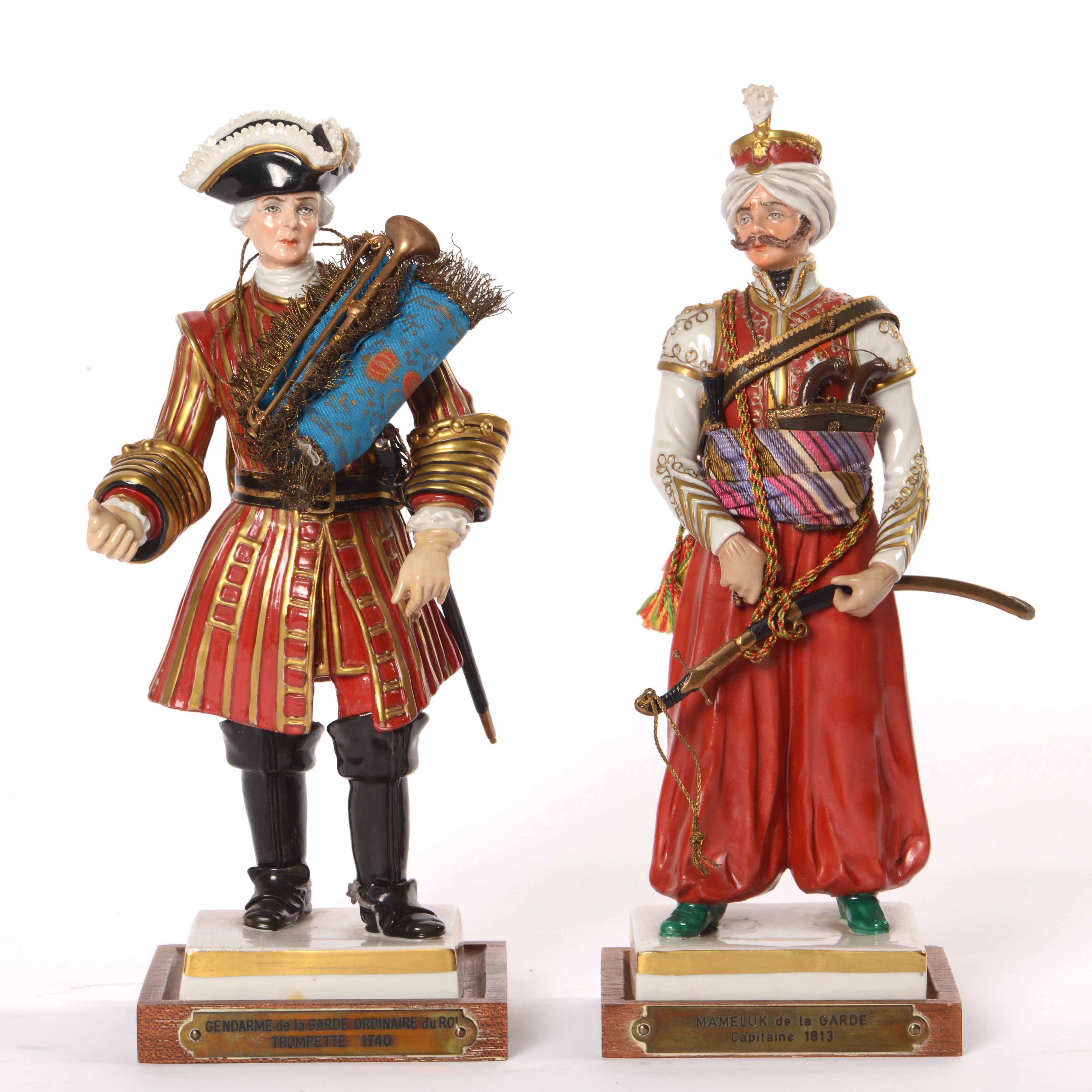 Coppia di figure in porcellana policroma. Trombettiere e Mammalucco