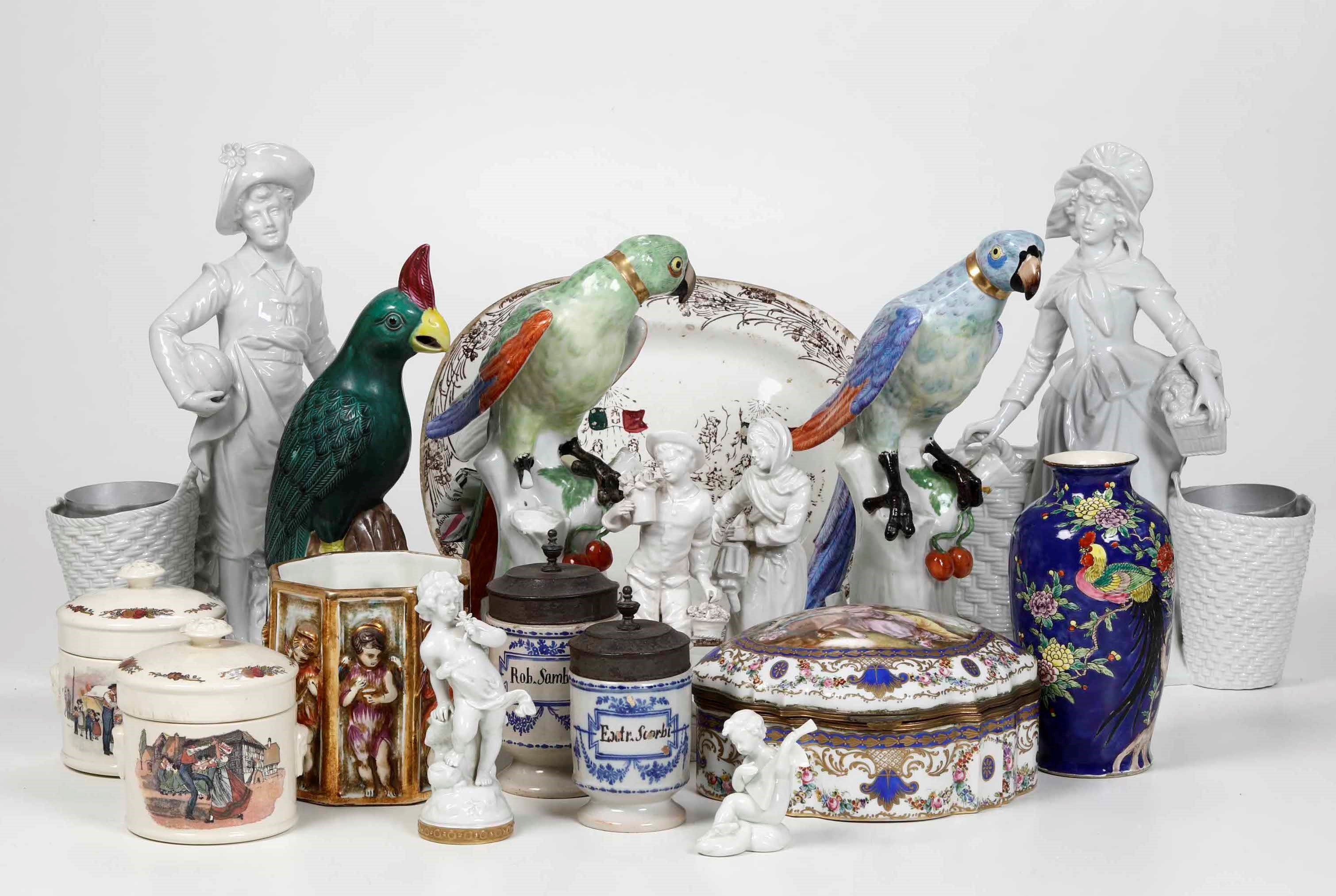Diversi oggetti tra cui scatole e figurine in porcellana