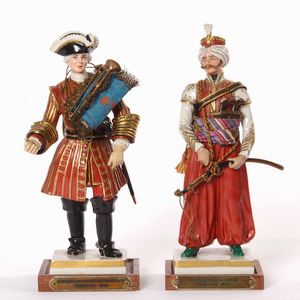 Coppia di figure in porcellana policroma. Trombettiere e Mammalucco