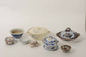 Diversi oggetti tra cui scatole e figurine in porcellana