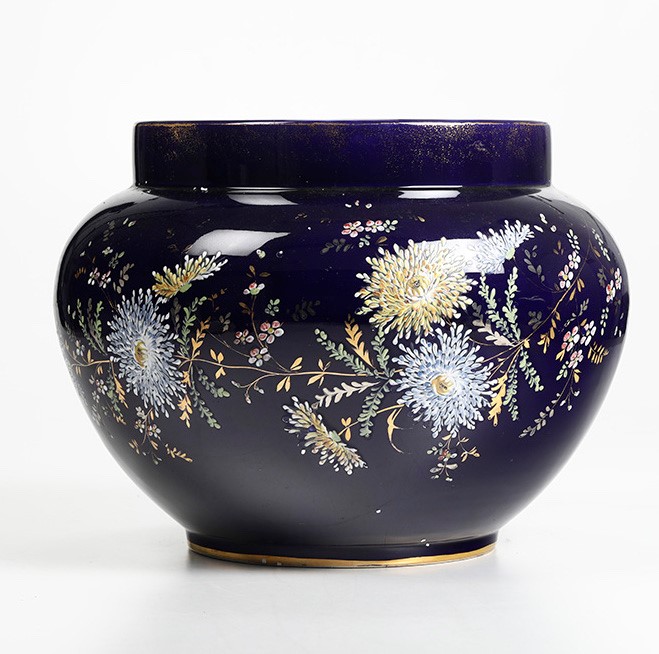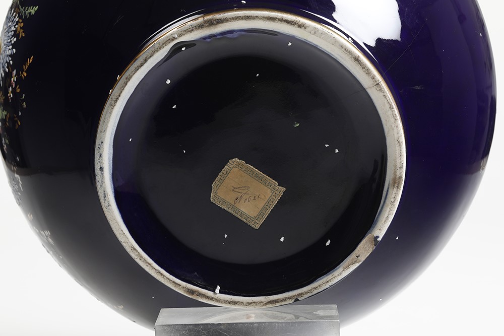 Vaso a fondo blu decorato a fiori in policromia oro e platino, XX secolo